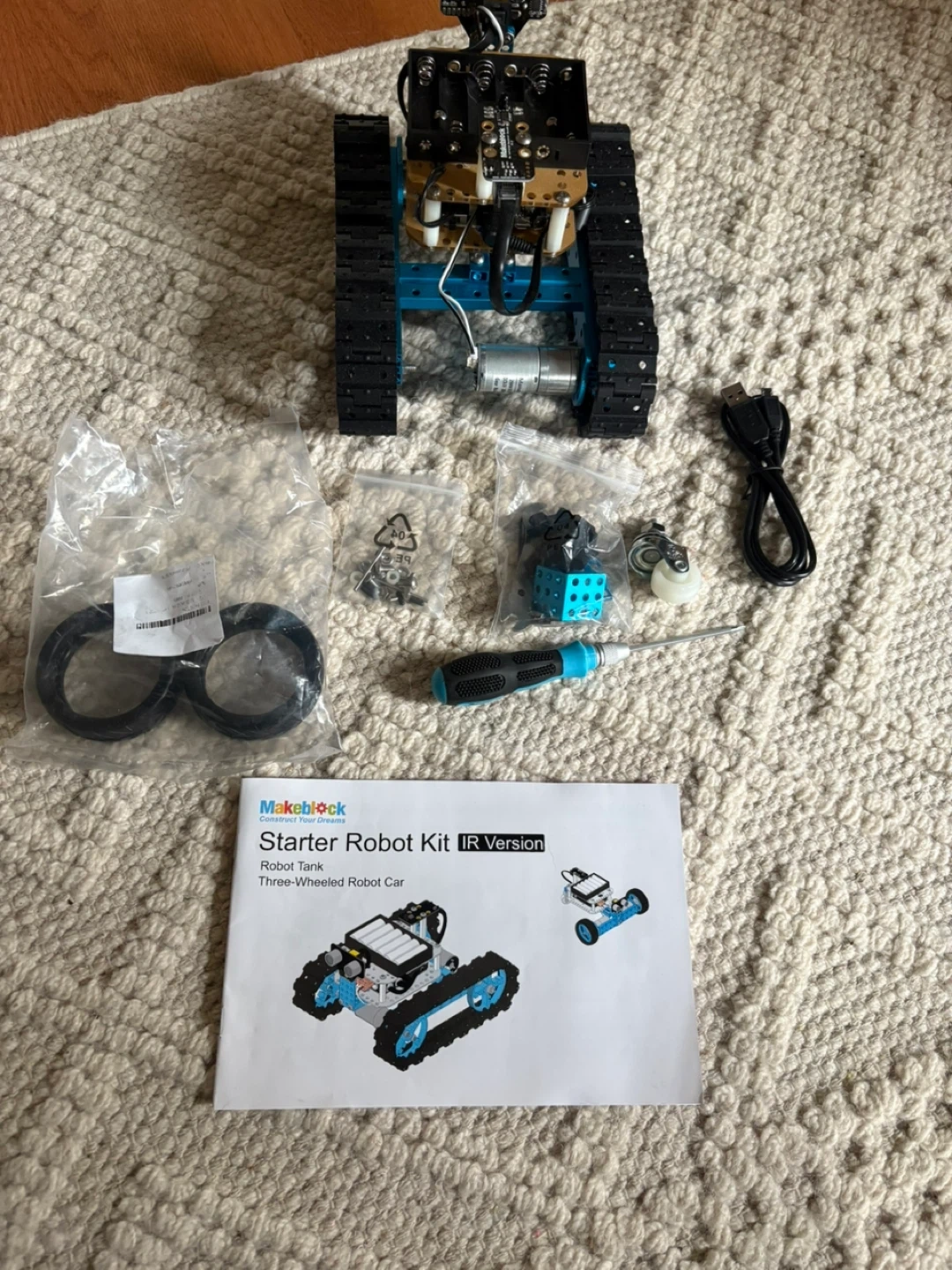 This is the Makeblock Starter Robot Kit in the IR Version. It includes the components needed to build a robot tank and a three-wheeled robot car. Assembly likely requires the included screwdriver. It's a fun kit for building and learning about robotics!