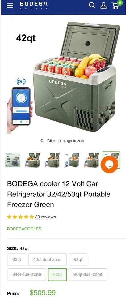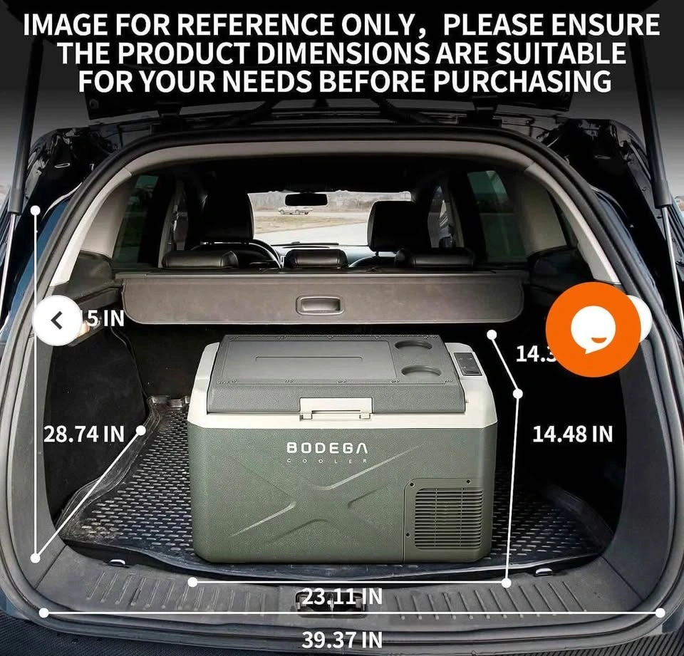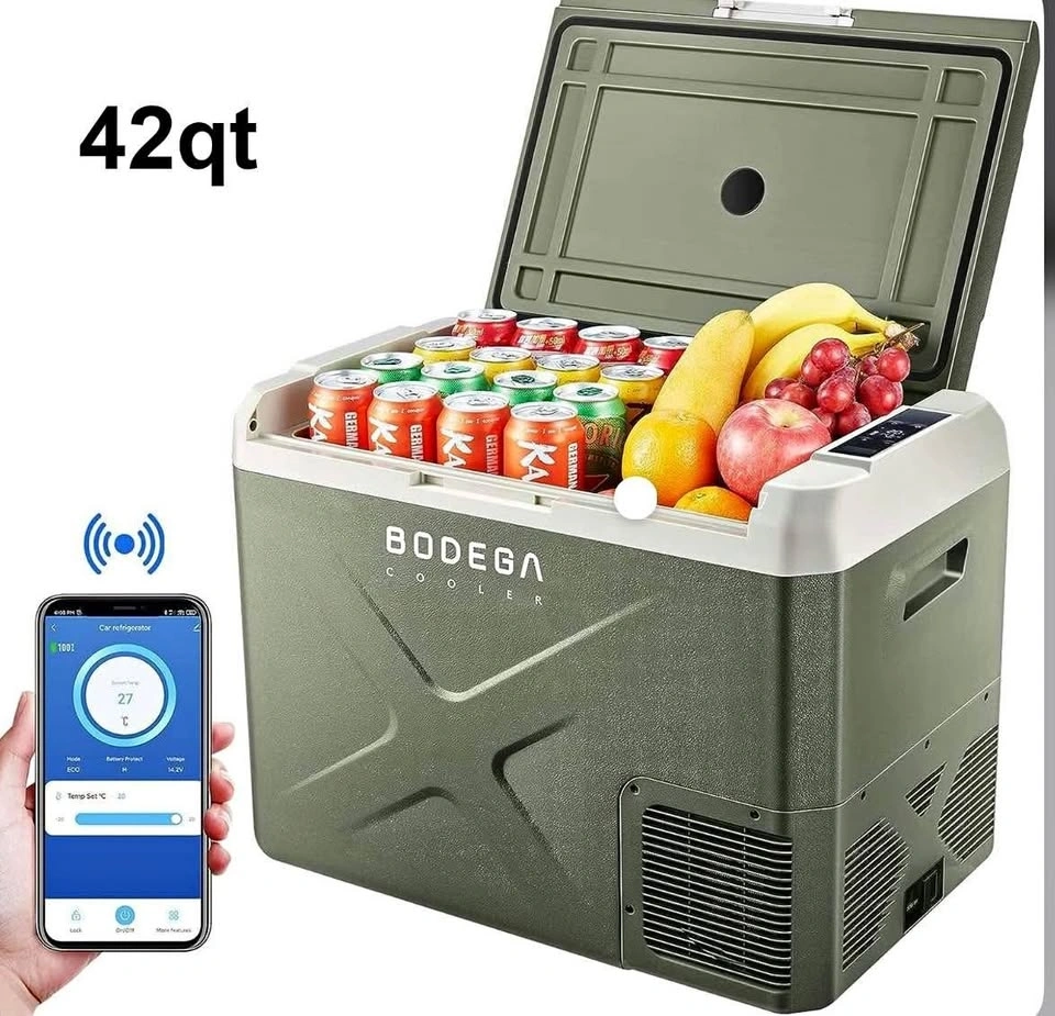 Brand new BODEGA 42Qt Portable Car Fridge Freezer (Green). Dual zone design – fridge & freezer in one. Works on 12V/24V DC or 110V AC. App-controlled, energy-efficient, and super quiet. Perfect for camping, road trips, or RVs!