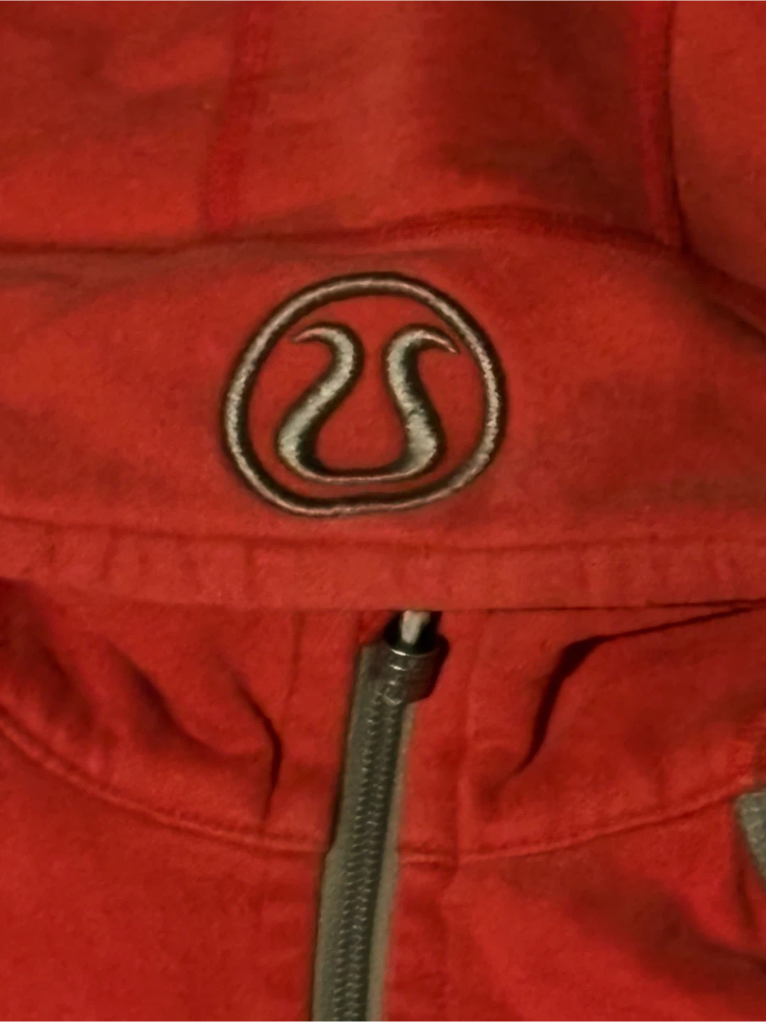 This is a red and grey Lululemon zip-up hoodie. It has thumbholes in the sleeves. It's made of a soft, comfortable material.