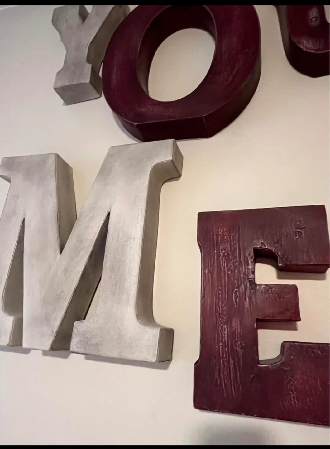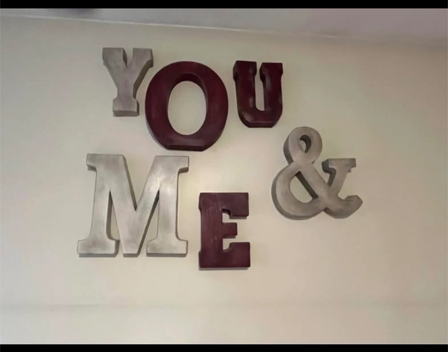 Decorative letters spelling "YOU & ME". Some letters are grey and some are a deep red colour. Add a personal touch to your living space!