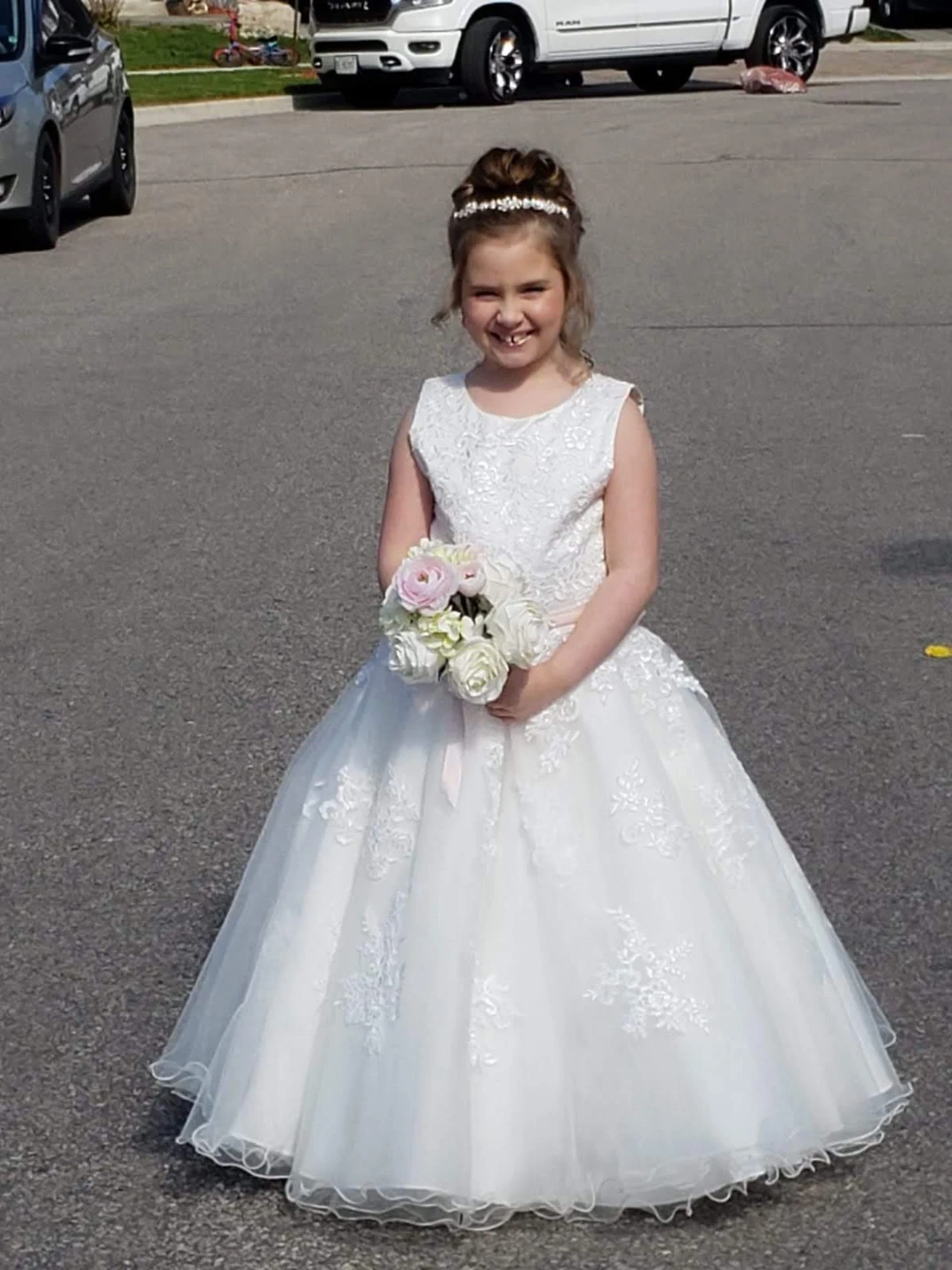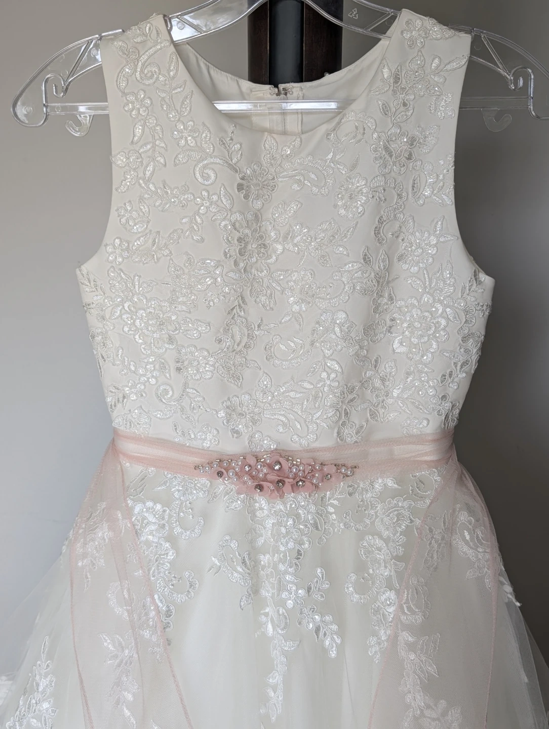 Sweetie Pie Collection lace princess dress, size 10TL. Worn once (1 hour!) for Covid wedding photos only. Includes pink beaded sash. Originally $330. $140 OBO.