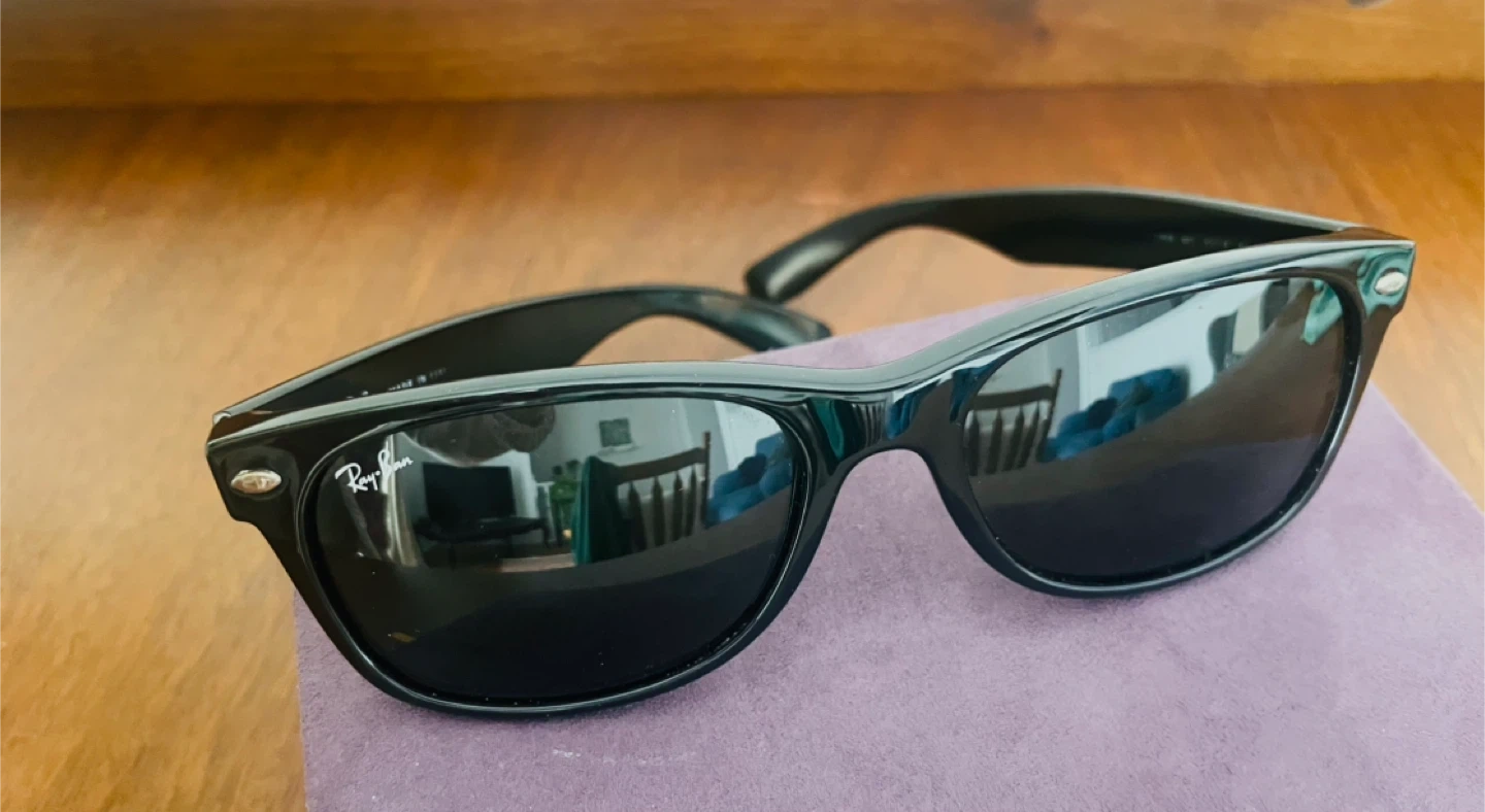 Classic black Ray-Ban Wayfarer sunglasses. These shades are made in Italy and feature a stylish, timeless design. They're perfect for sunny days and adding a touch of cool to any outfit!