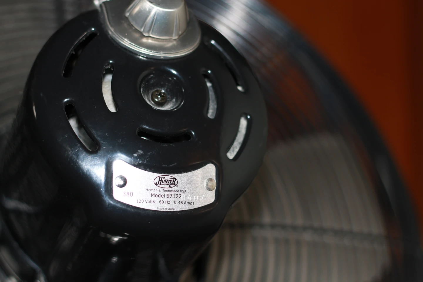 Hunter pedestal fan, model 97122. Operates on 120 volts, 60 Hz, with a 0.48 amp rating. It's black and includes a sturdy base and adjustable height.