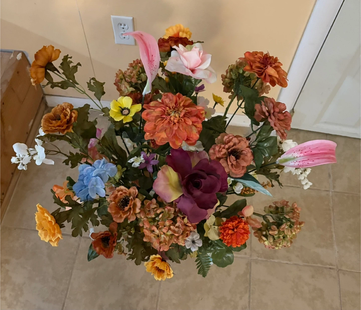 A large artificial floral arrangement featuring a variety of colorful flowers and greenery. It's housed in a decorative burgundy vase. This arrangement adds a vibrant touch to any room! About : 37”