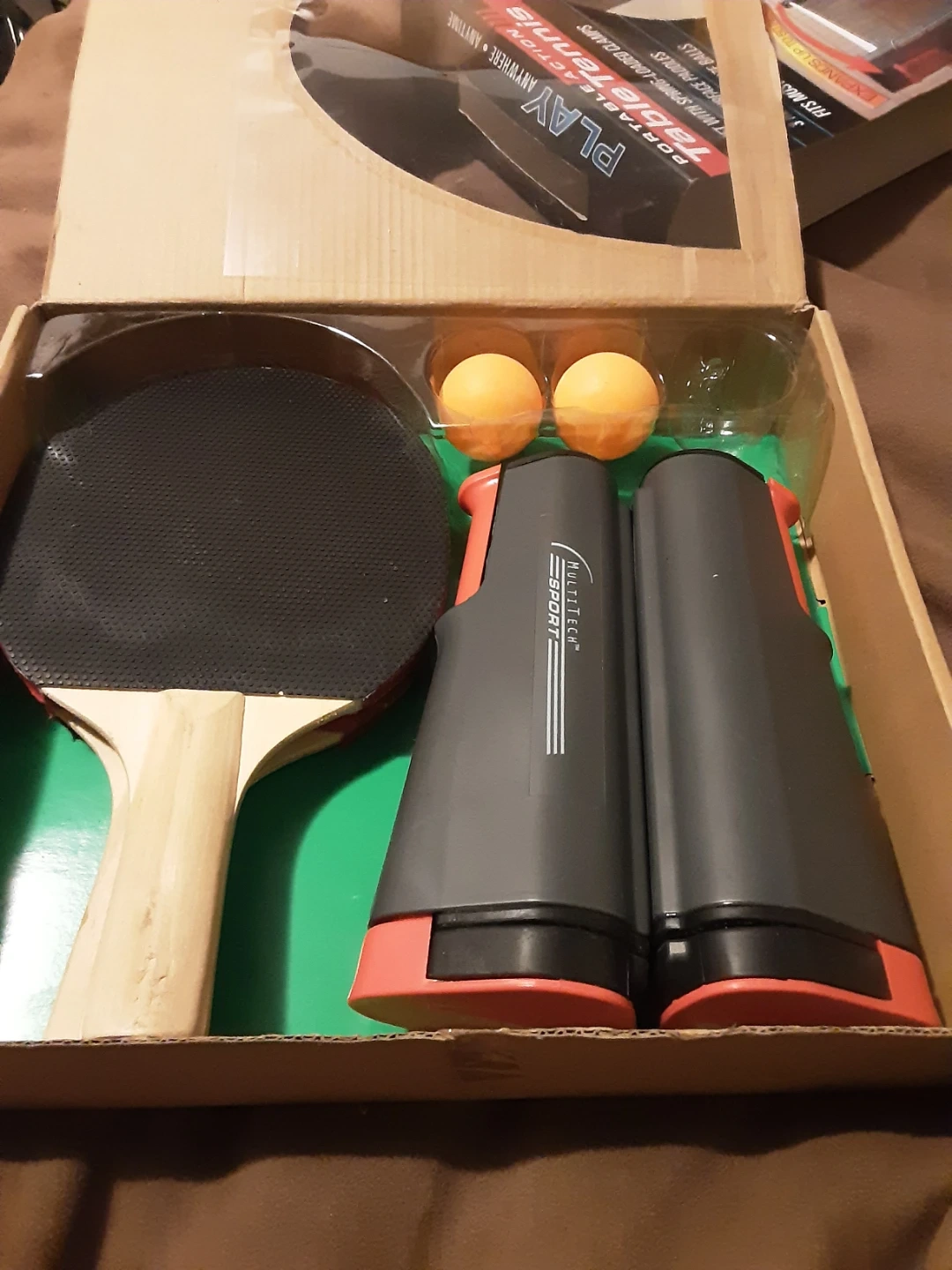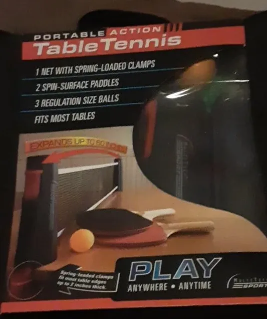 As described on box, it is a portable Table Tennis set, except for a few differences. One out of two paddles has a crossed out name on it, and there are only 2 out of 3 balls. Trying to sell because I can't use it myself.