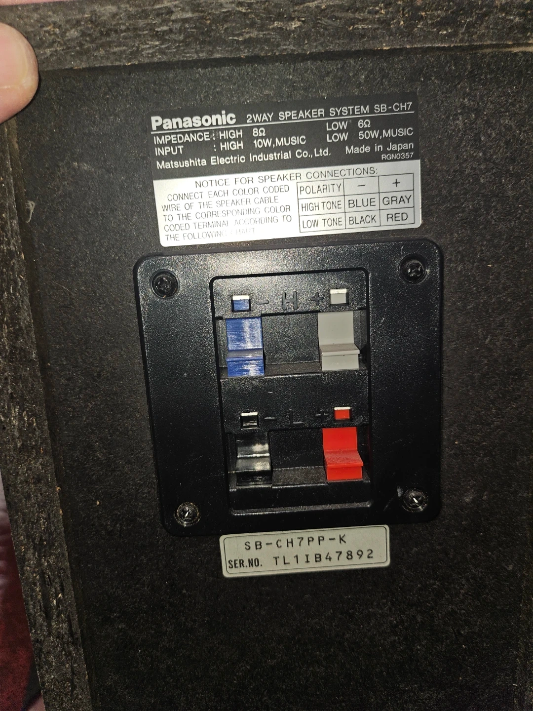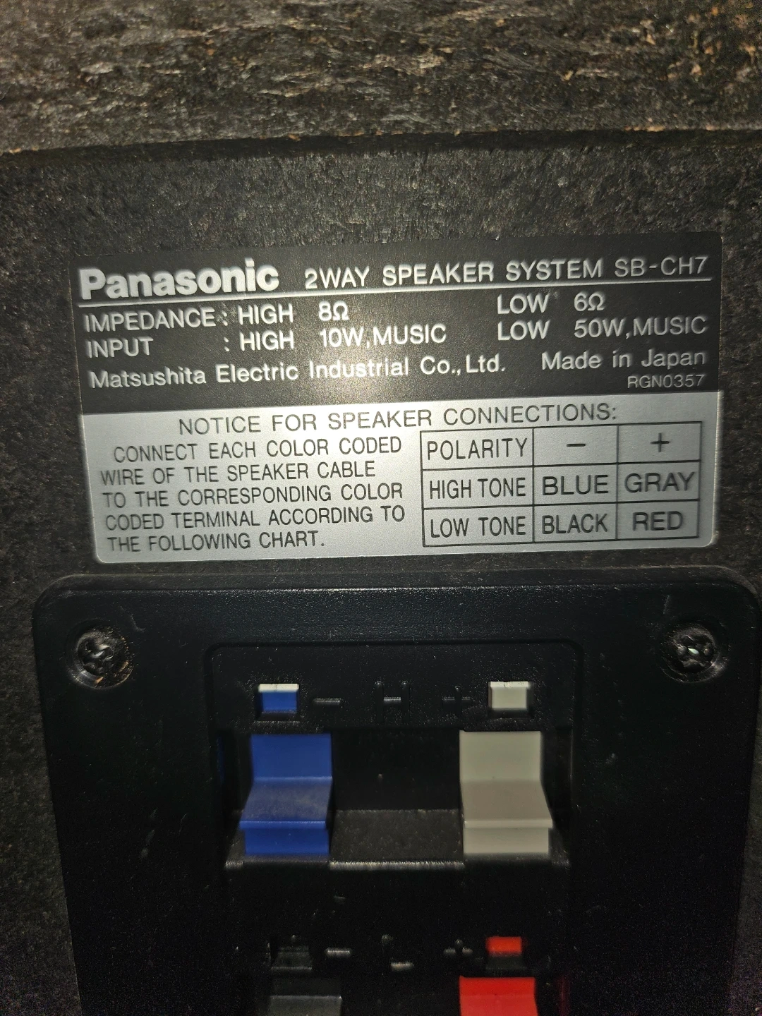 A pair of black Panasonic SB-CH7 2-way speaker systems. They're made in Japan and have an impedance of 8 ohms. Each speaker has a high tone input of 10W (music) and a low tone input of 50W (music).