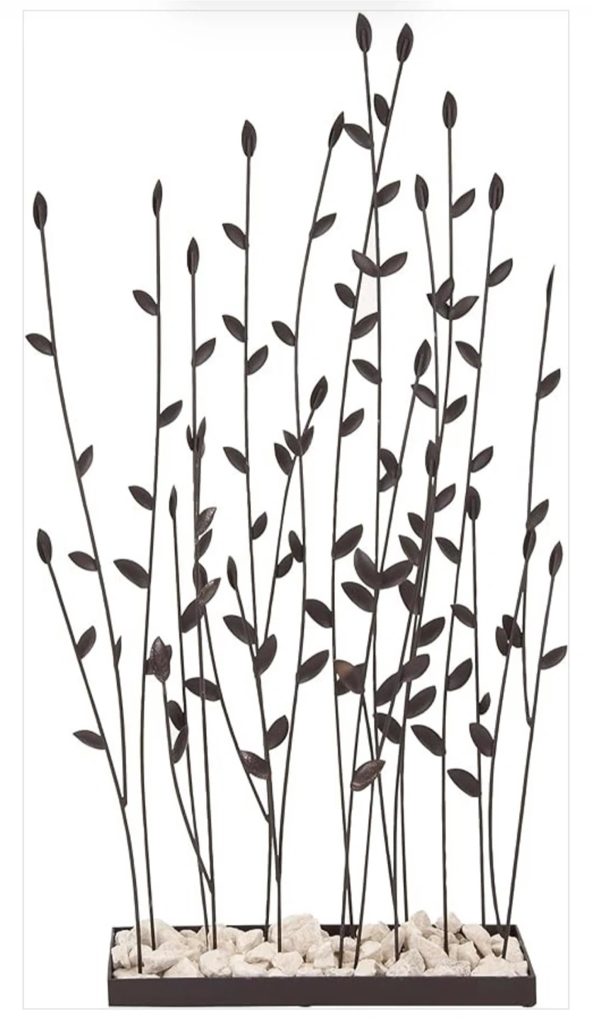 This decorative metal sculpture features tall, slender stalks with small leaves, resembling grass. It's set in a dark rectangular base filled with white pebbles. This piece adds a natural, artistic touch to any shelf or tabletop.