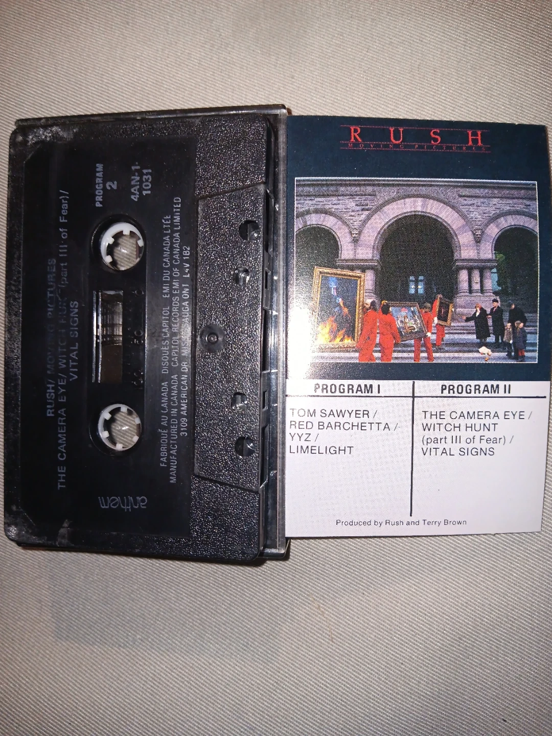 Rush Moving Pictures cassette tape. Includes "Tom Sawyer", "Limelight", "The Camera Eye", and "Vital Signs". Manufactured in Canada by Anthem Records.