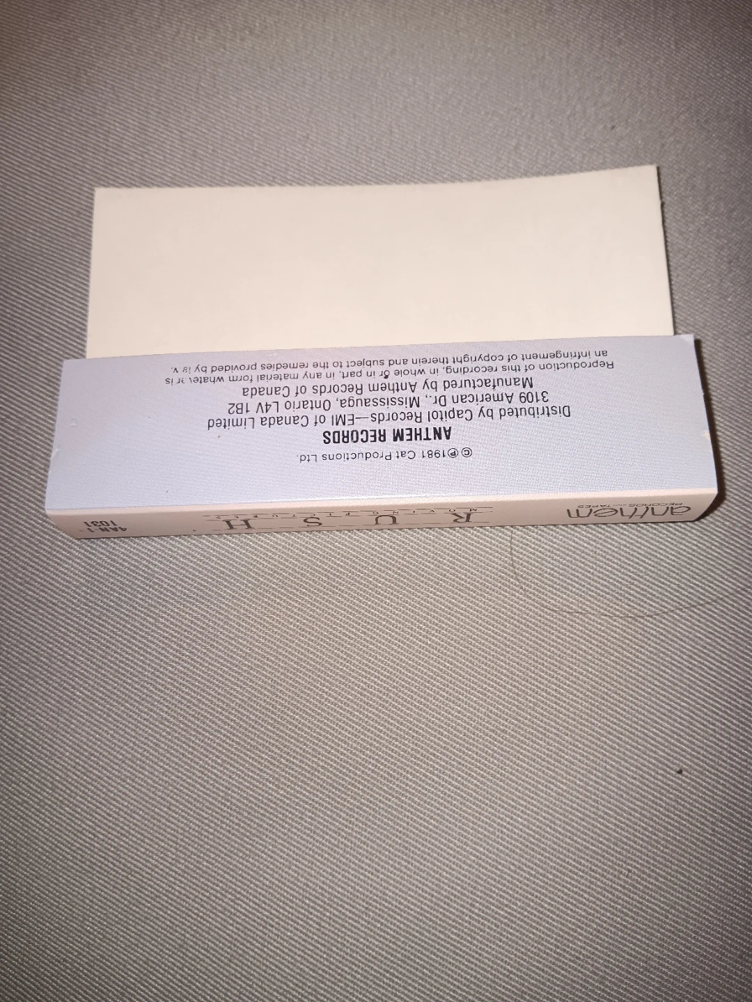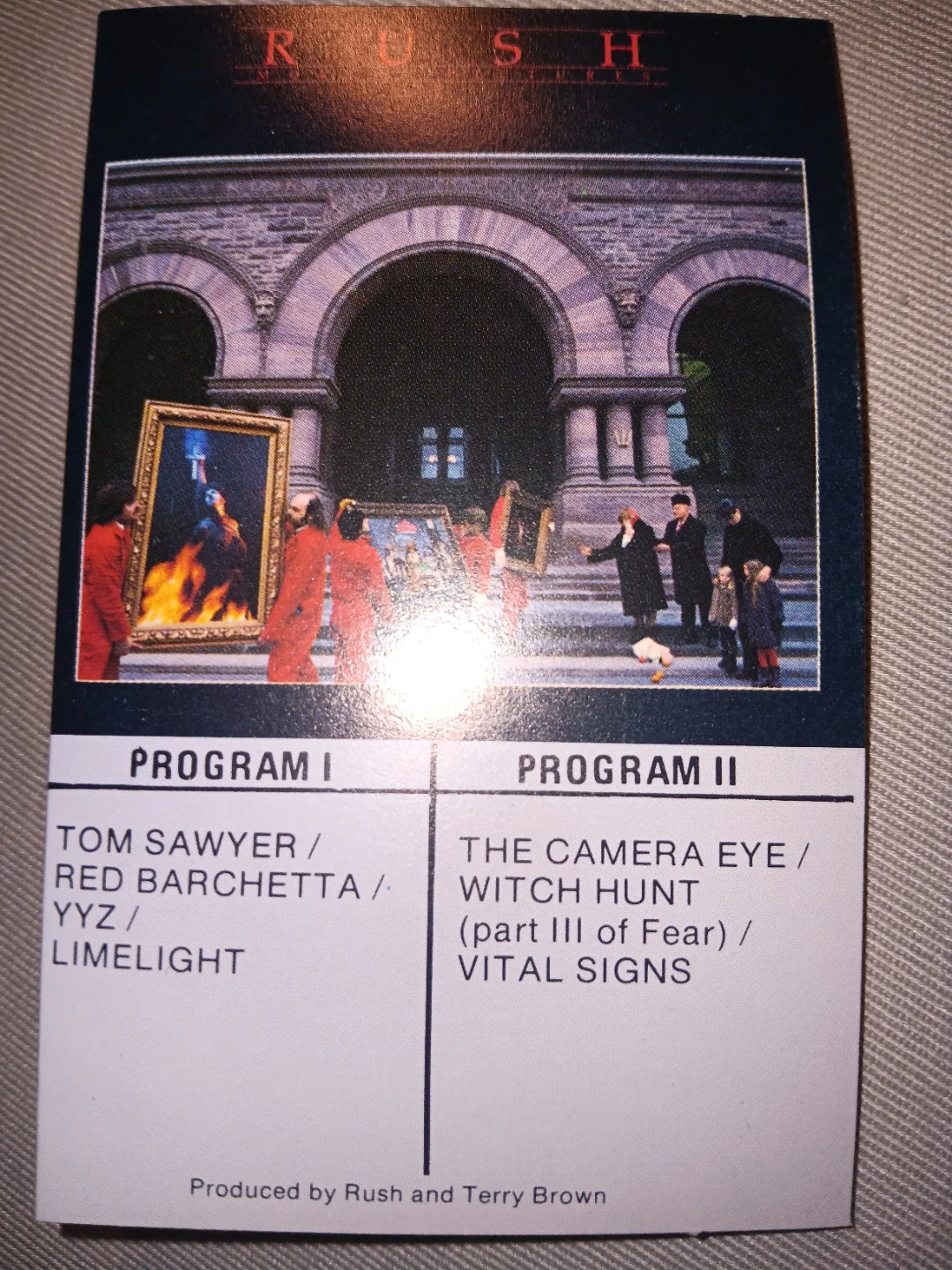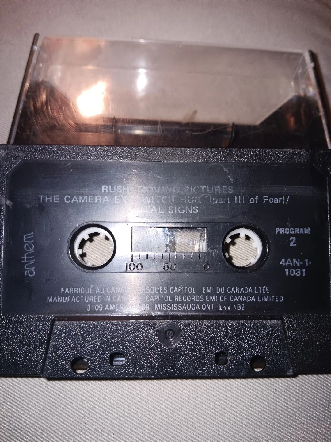 Rush Moving Pictures cassette tape. Includes "Tom Sawyer", "Limelight", "The Camera Eye", and "Vital Signs". Manufactured in Canada by Anthem Records.