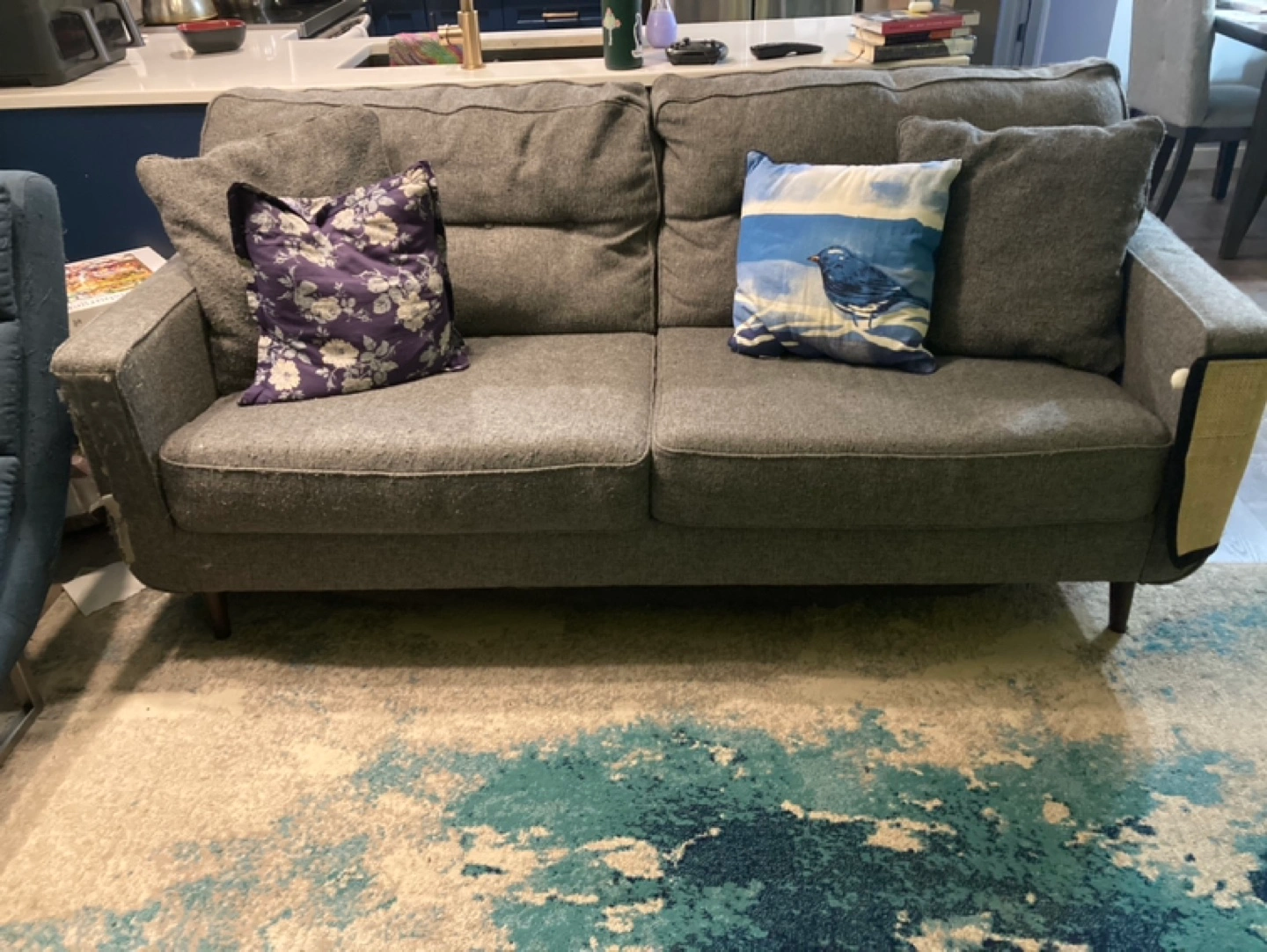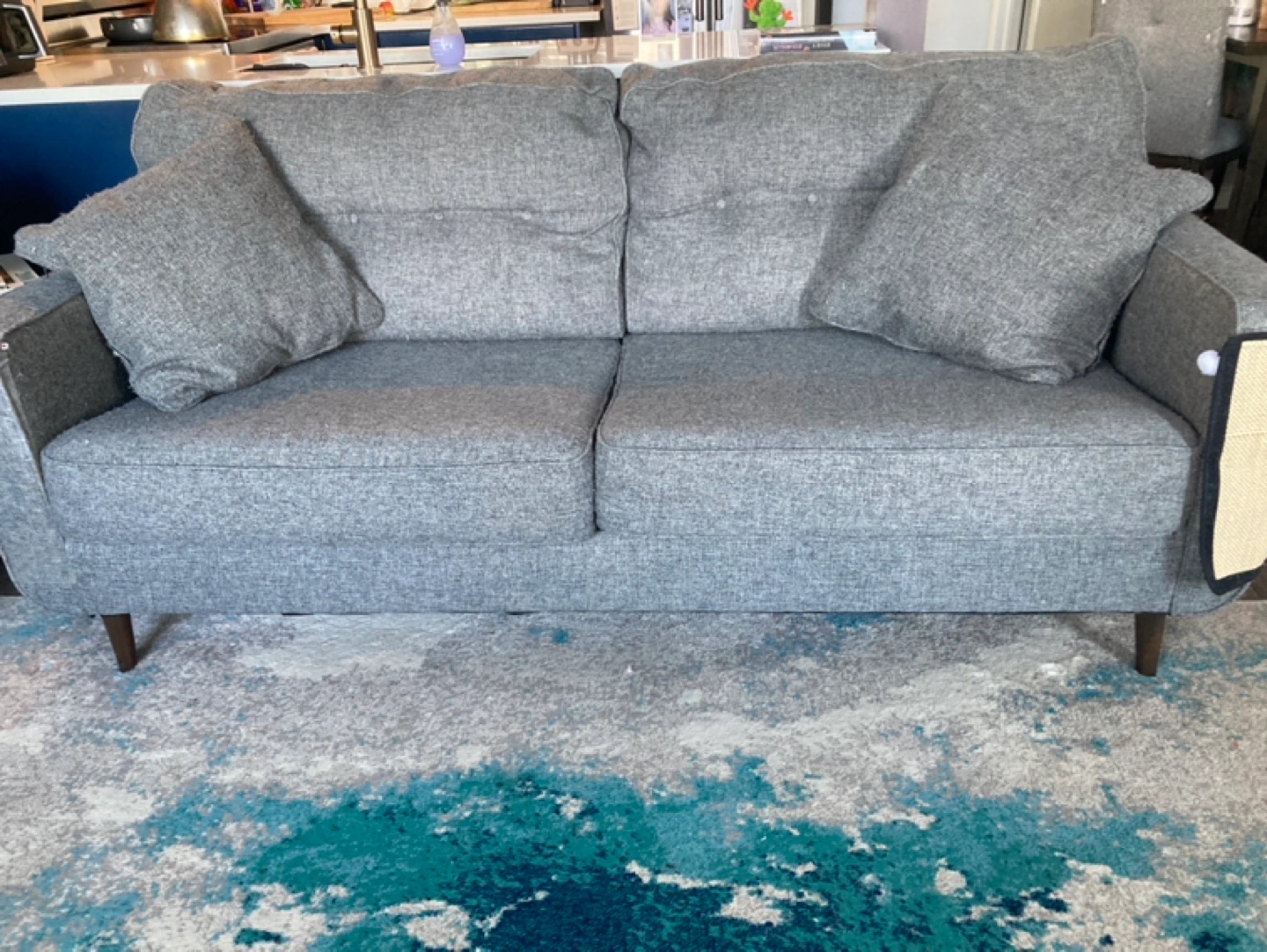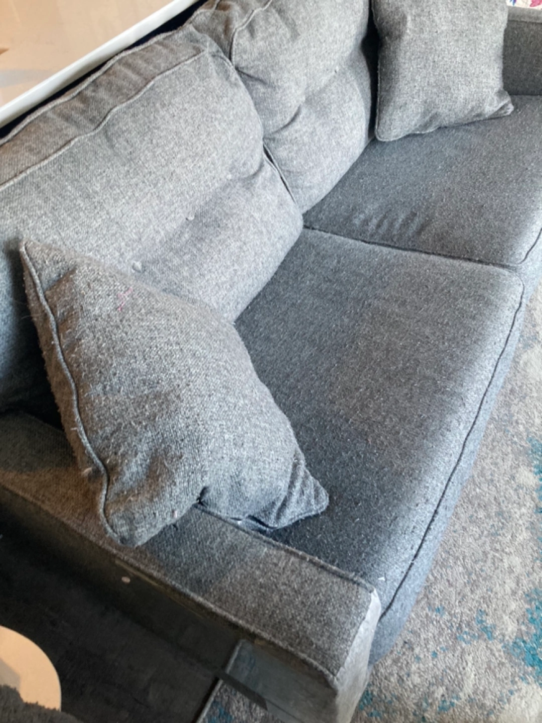 Grey fabric sofa. Mid-century modern style. Wooden legs. Includes two throw pillows. Some wear and tear visible. We are a pet home.