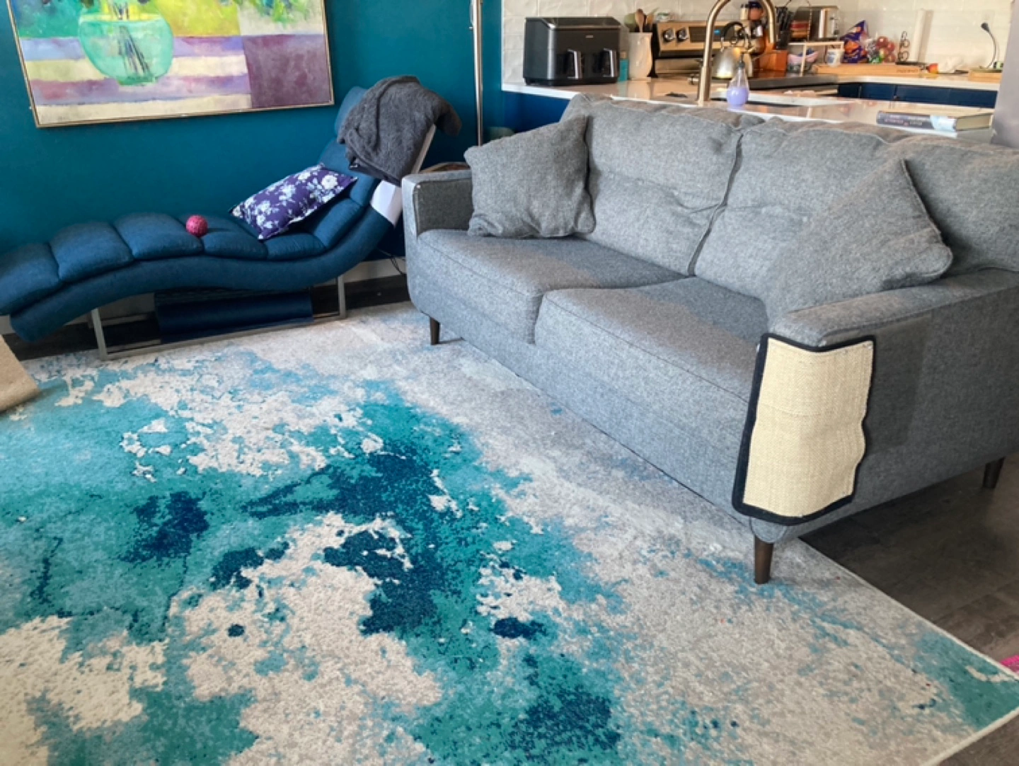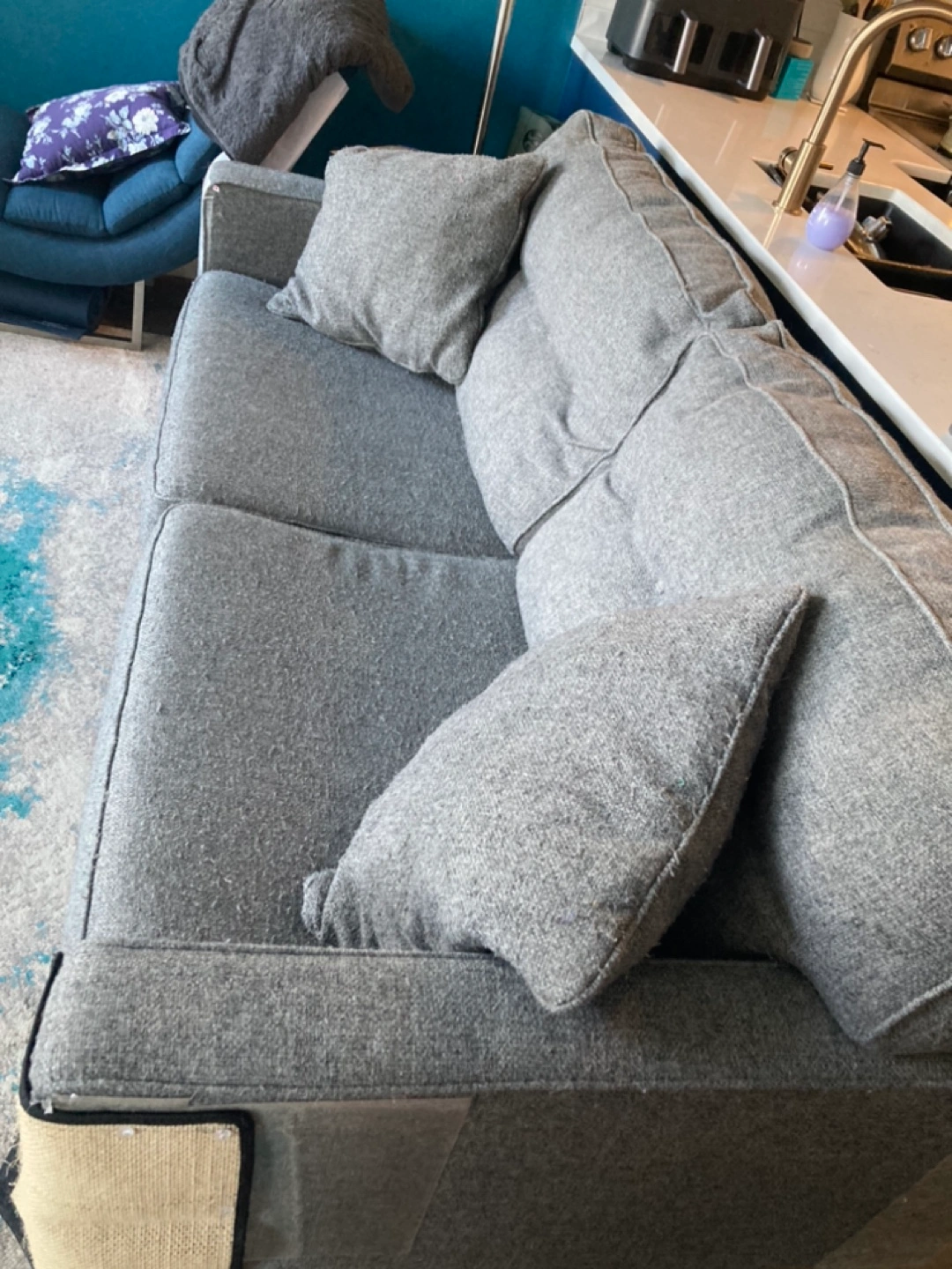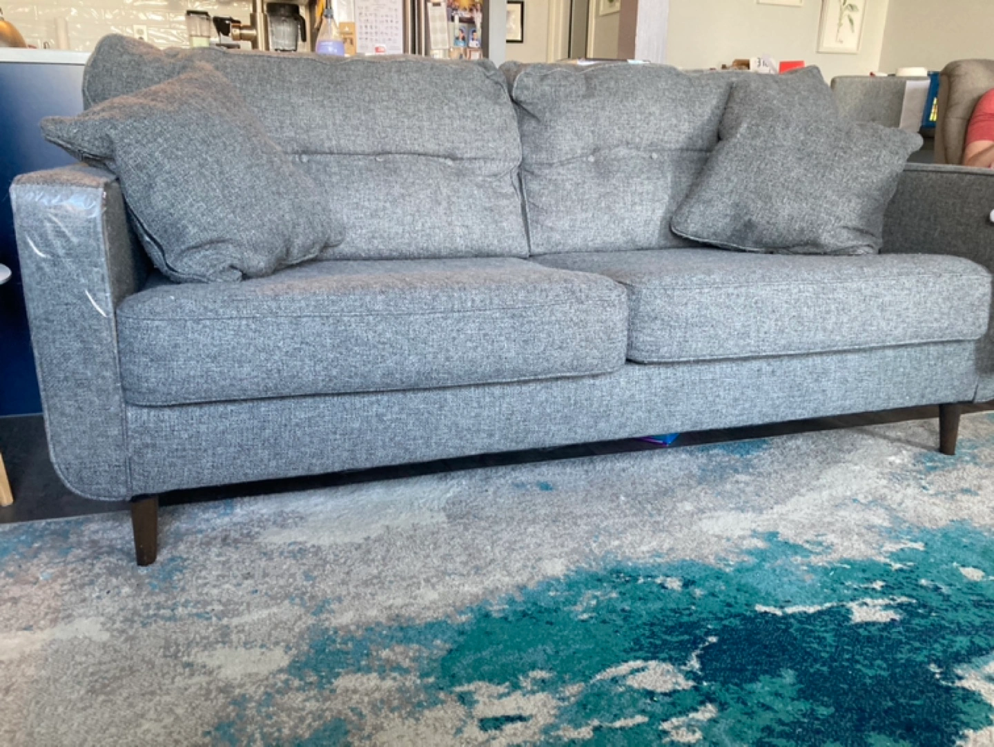 Grey fabric sofa. Mid-century modern style. Wooden legs. Includes two throw pillows. Some wear and tear visible. We are a pet home.