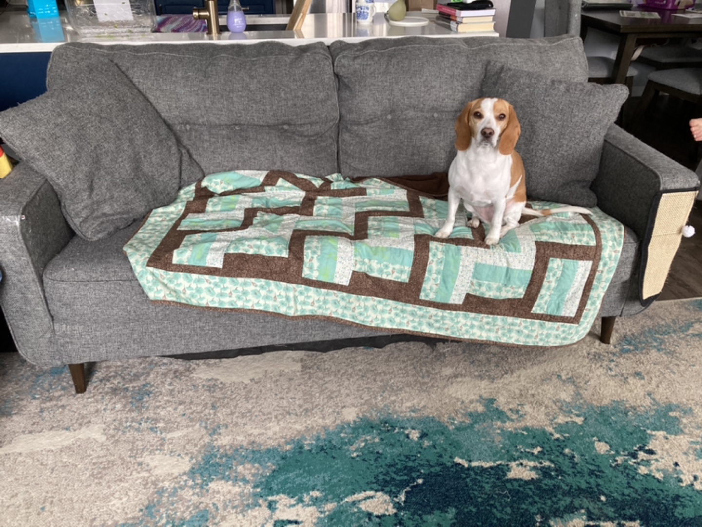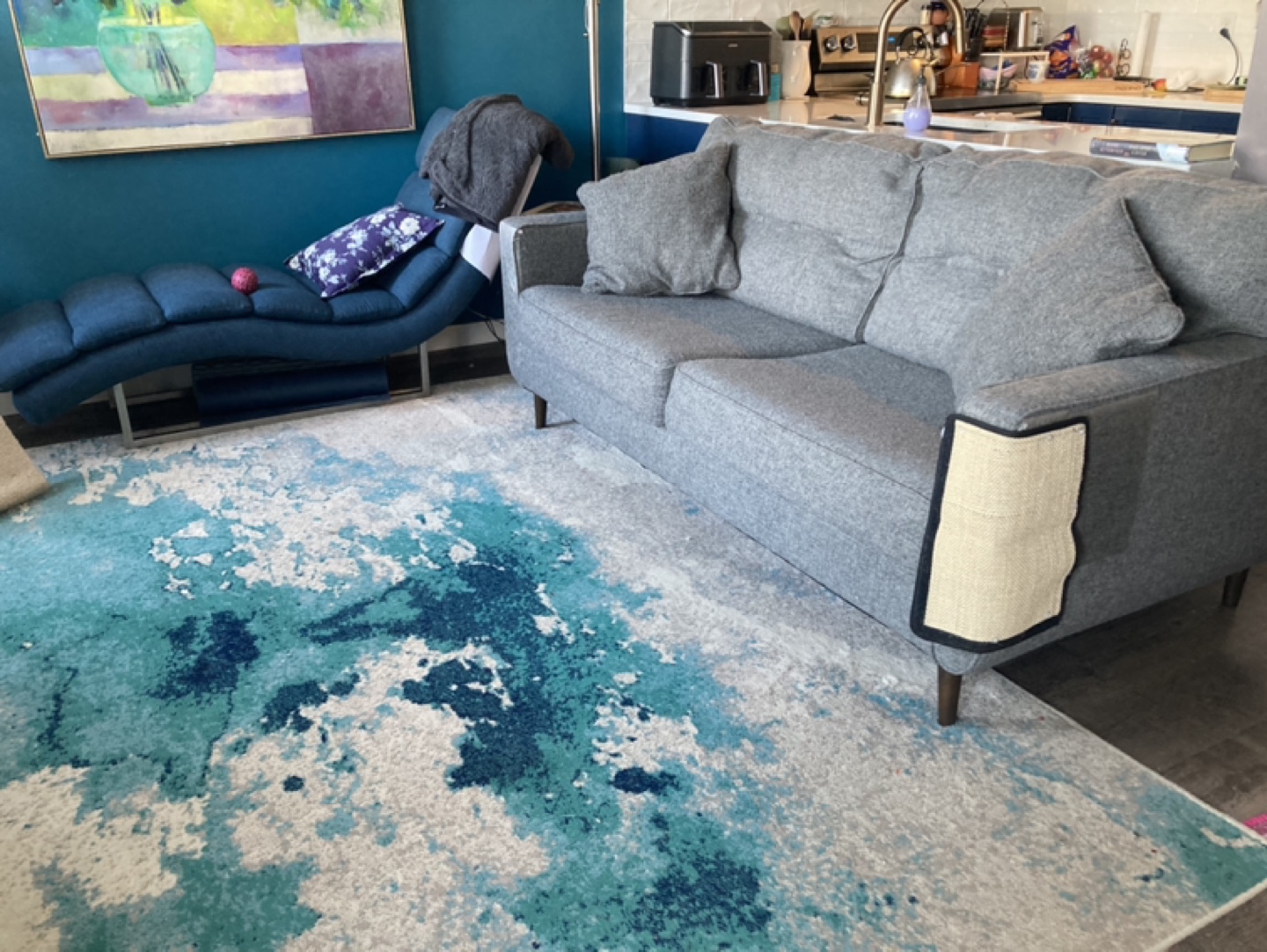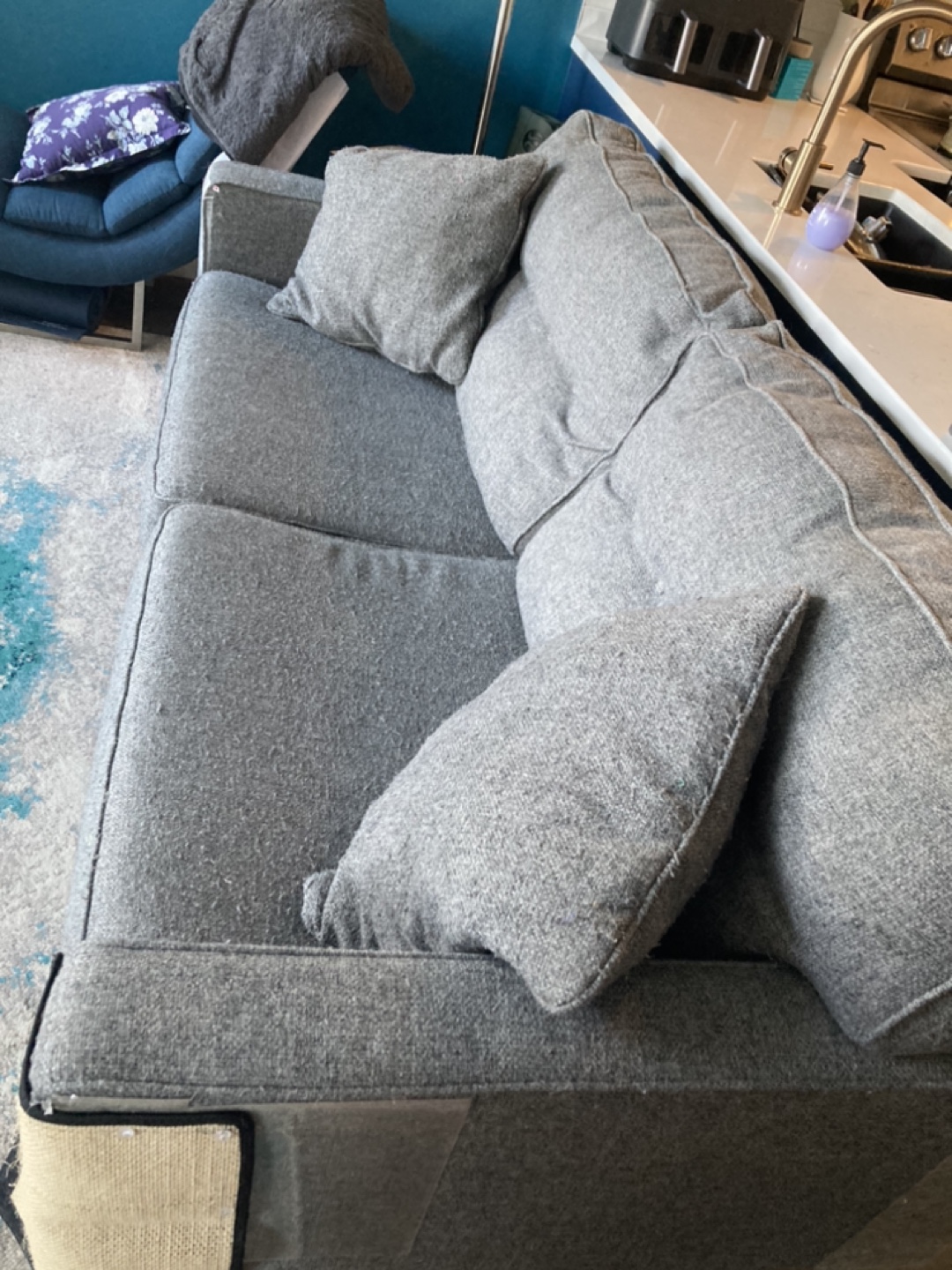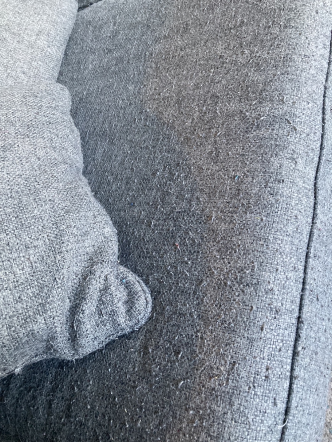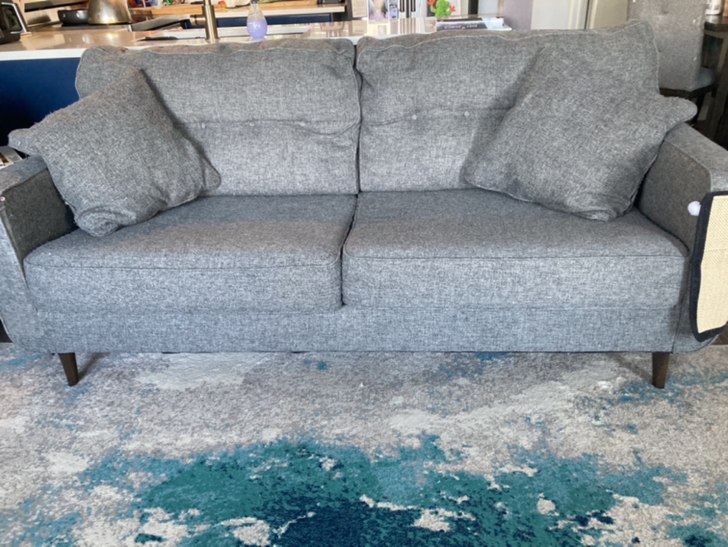 Grey fabric sofa. Mid-century modern style. Wooden legs. Includes two throw pillows. Some wear and tear visible. We are a pet home.