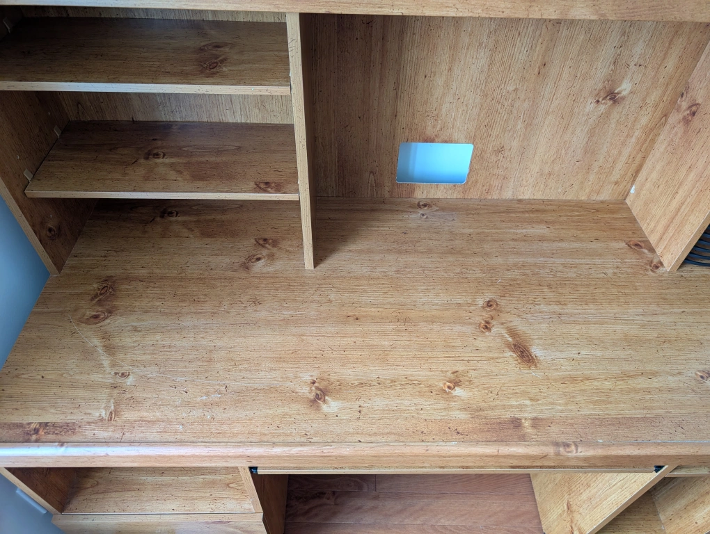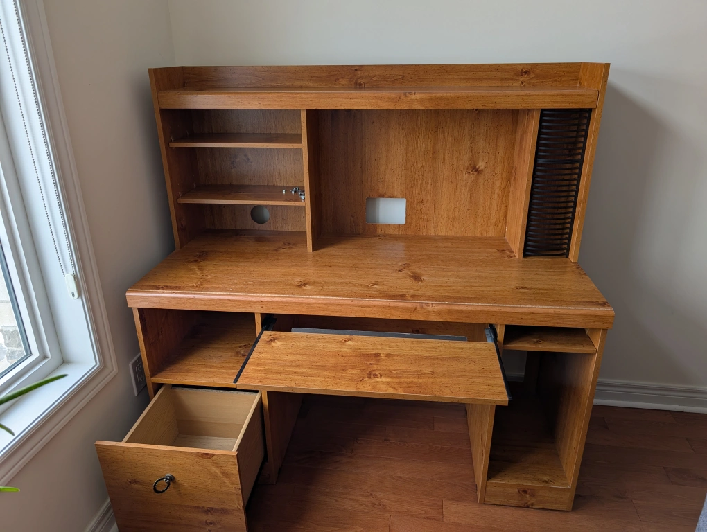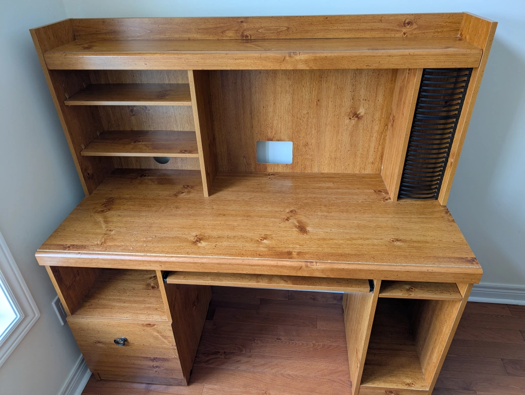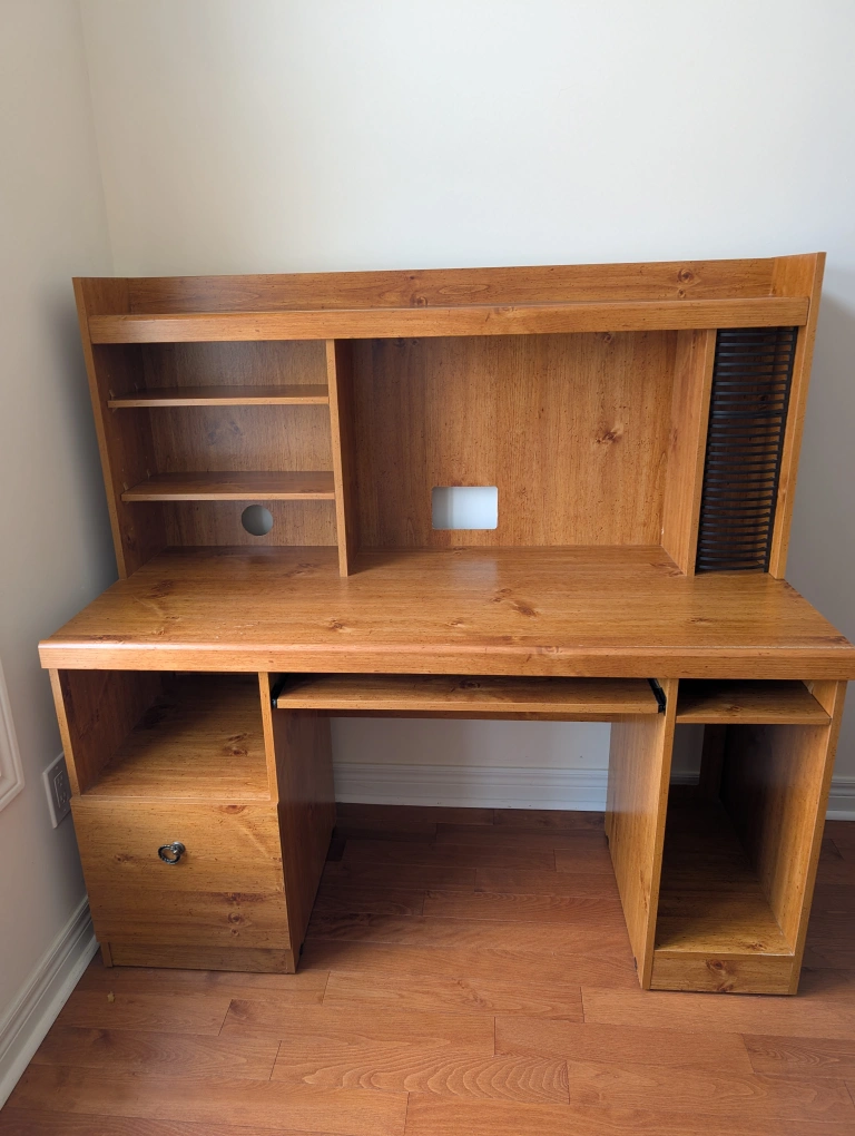 Wooden computer desk with hutch. Features a pull-out keyboard tray, file drawer, and shelves. Good for home office.