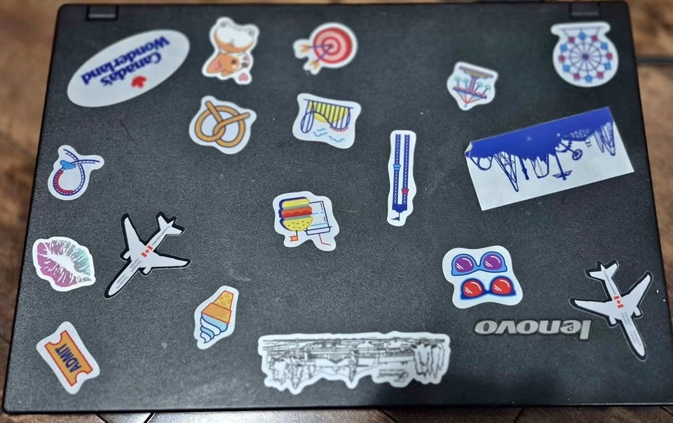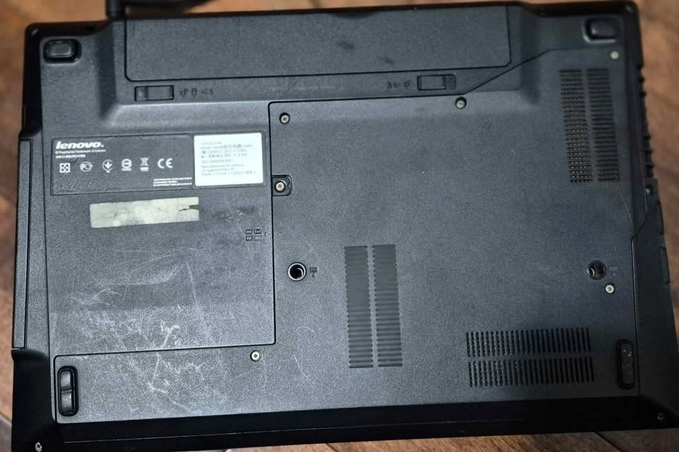 Black Lenovo E49 laptop (Model: 3464) available. It has many cool stickers on the lid. The bottom has some scuffs and scratches from normal use. The keyboard and screen are clean. Good for everyday light tasks or school. The battery lasts around 30 minutes, so you need to keep the charging cable connected. It has Chrome OS Flex installed for smoother performance.