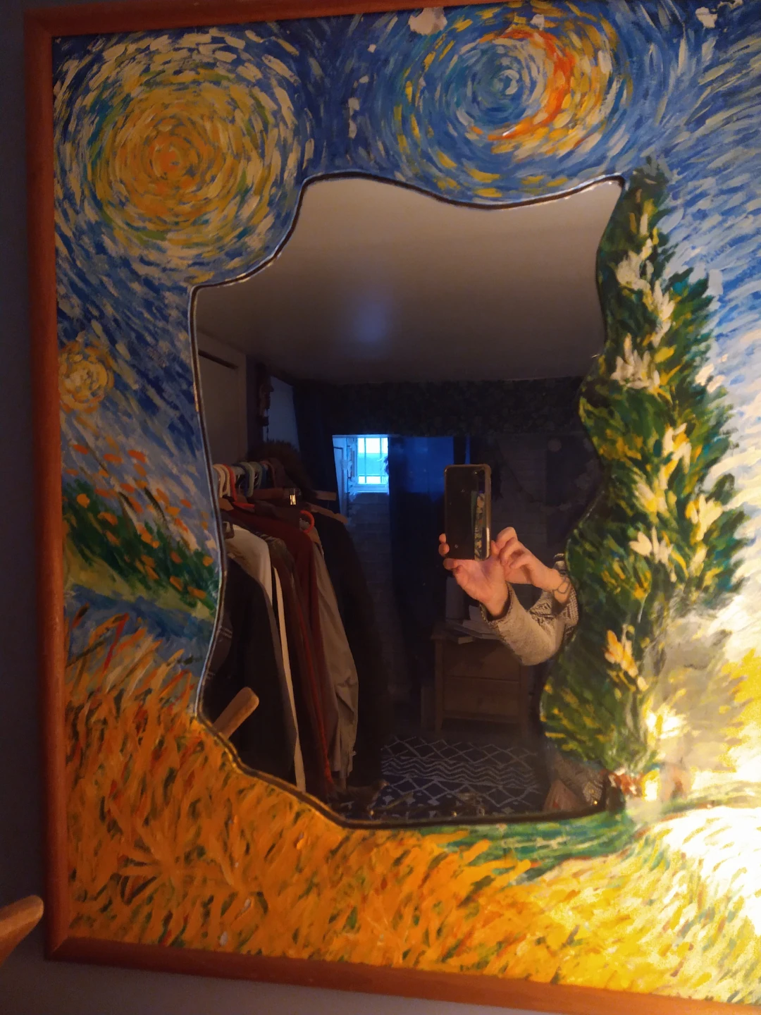Beautiful mirror with a hand-painted frame inspired by Van Gogh. The frame features swirls of blues and yellows, reminiscent of hus iconic paintings. It's a unique piece to add some artistic flair to your home!