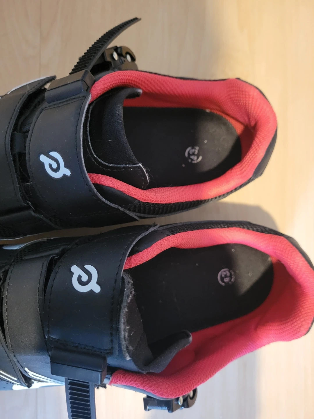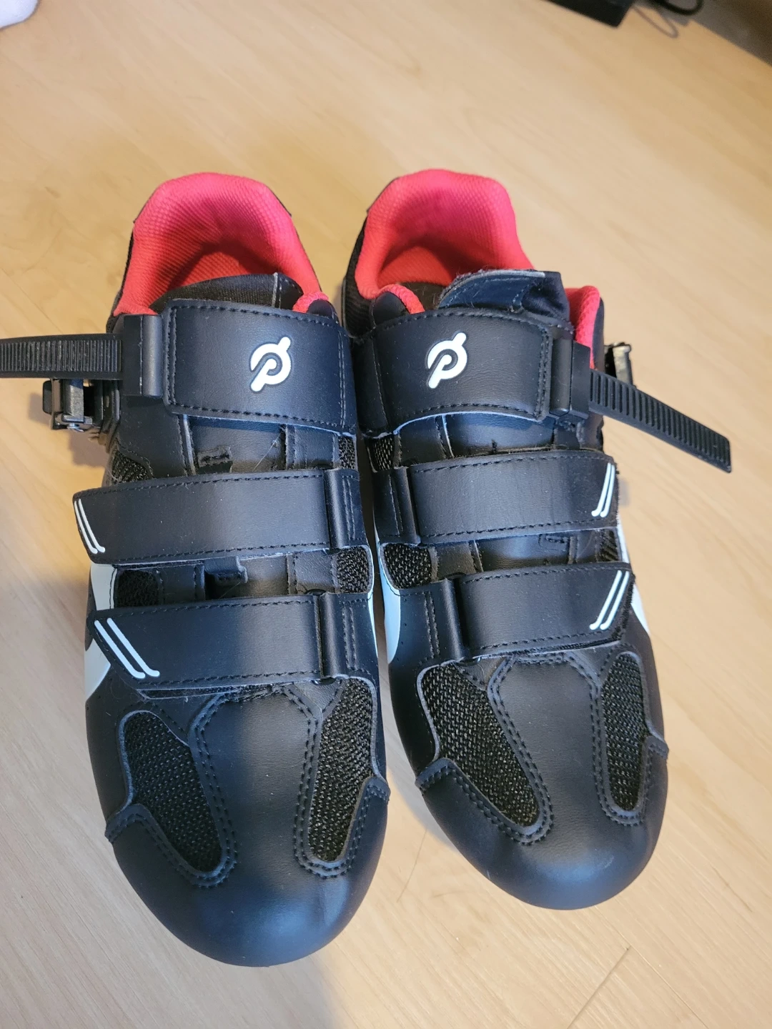 A Peloton bike and a pair of black Peloton cycling shoes. The shoes have red lining and adjustable straps. The bike features a large touchscreen display for classes. Perfect for home workouts!