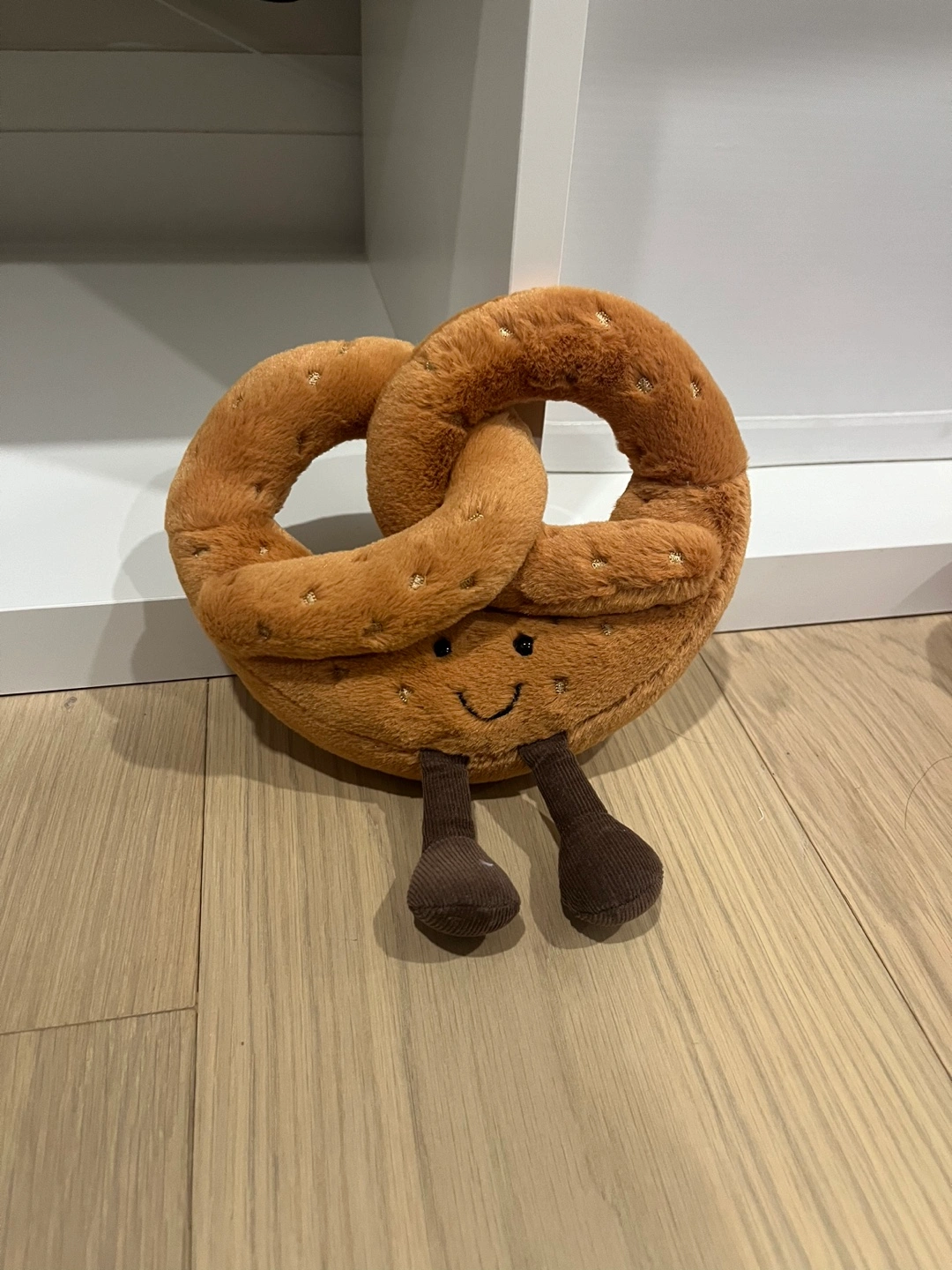 Retired jellycat. Soft, cuddly pretzel plush toy. Small size, perfect for a child's room or collector. Features a smiling face and small legs.