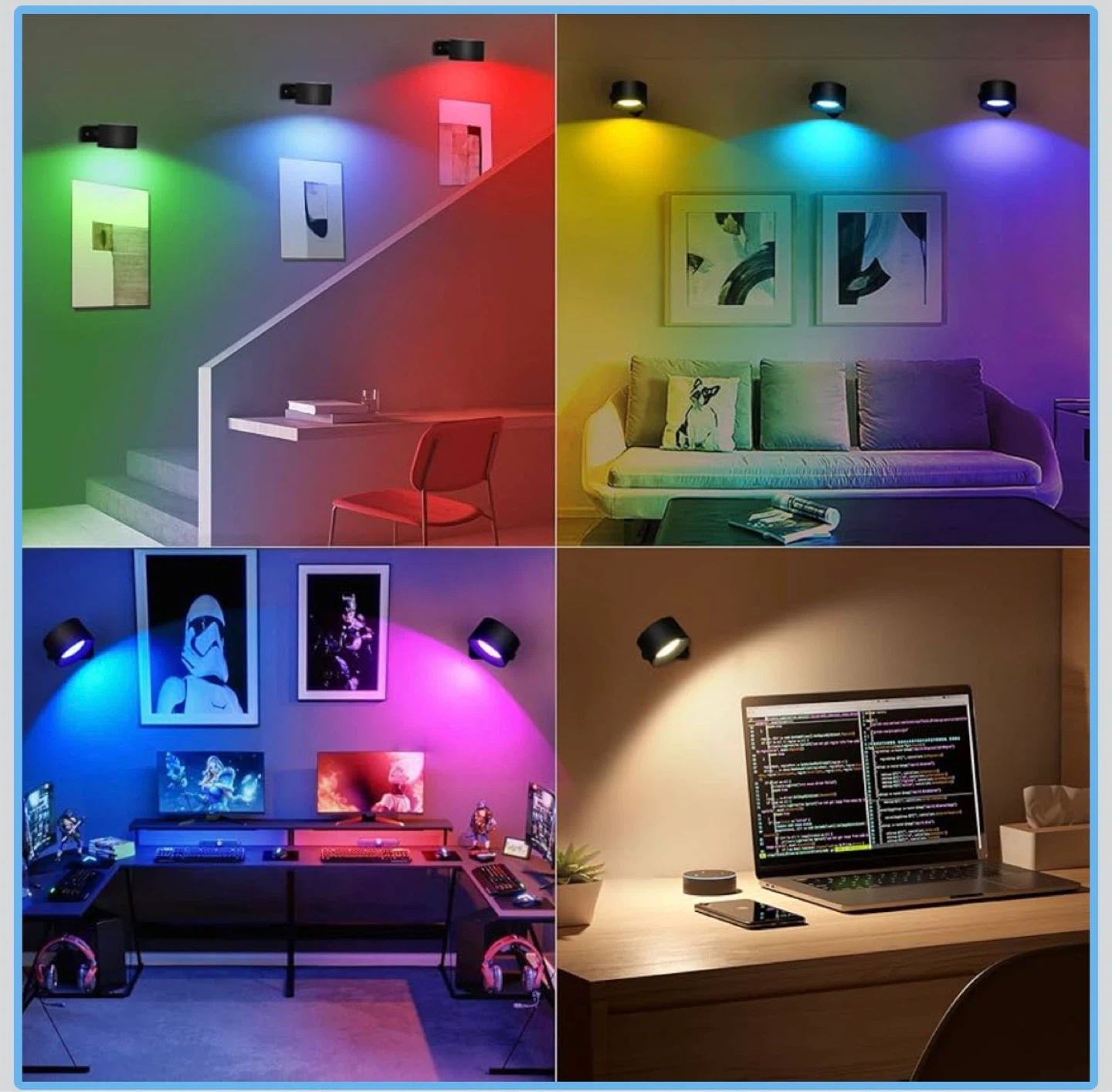 Black modern wall-mounted light fixture with full RGB colour options and adjustable white light. It comes with a remote for easy control and includes USB charging cable. Multiple lighting effects and colours available!