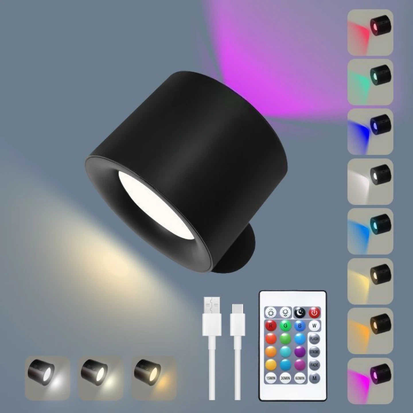 Black modern wall-mounted light fixture with full RGB colour options and adjustable white light. It comes with a remote for easy control and includes USB charging cable. Multiple lighting effects and colours available!