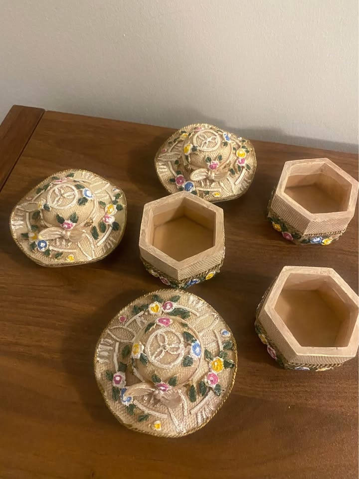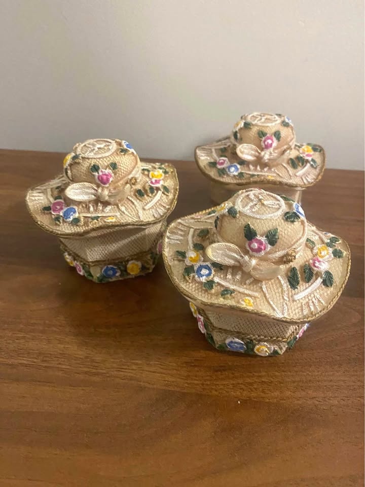 Set of 3 mini yellow sombrero hats trinket boxes! They have intricate designs with brown and white details. Great as party favors, boxes to keep little treasures, or as a gift box. I have more than one set available.