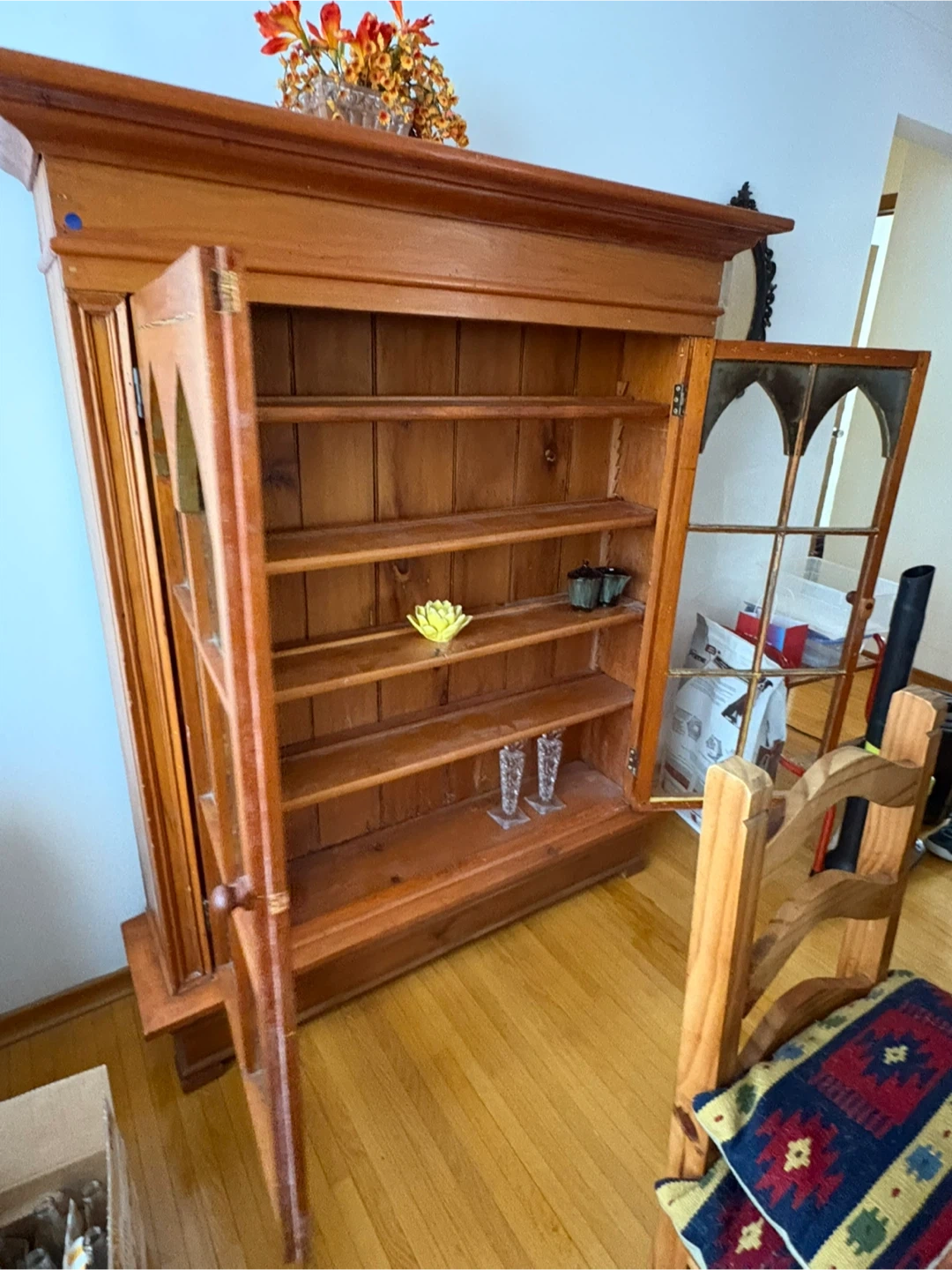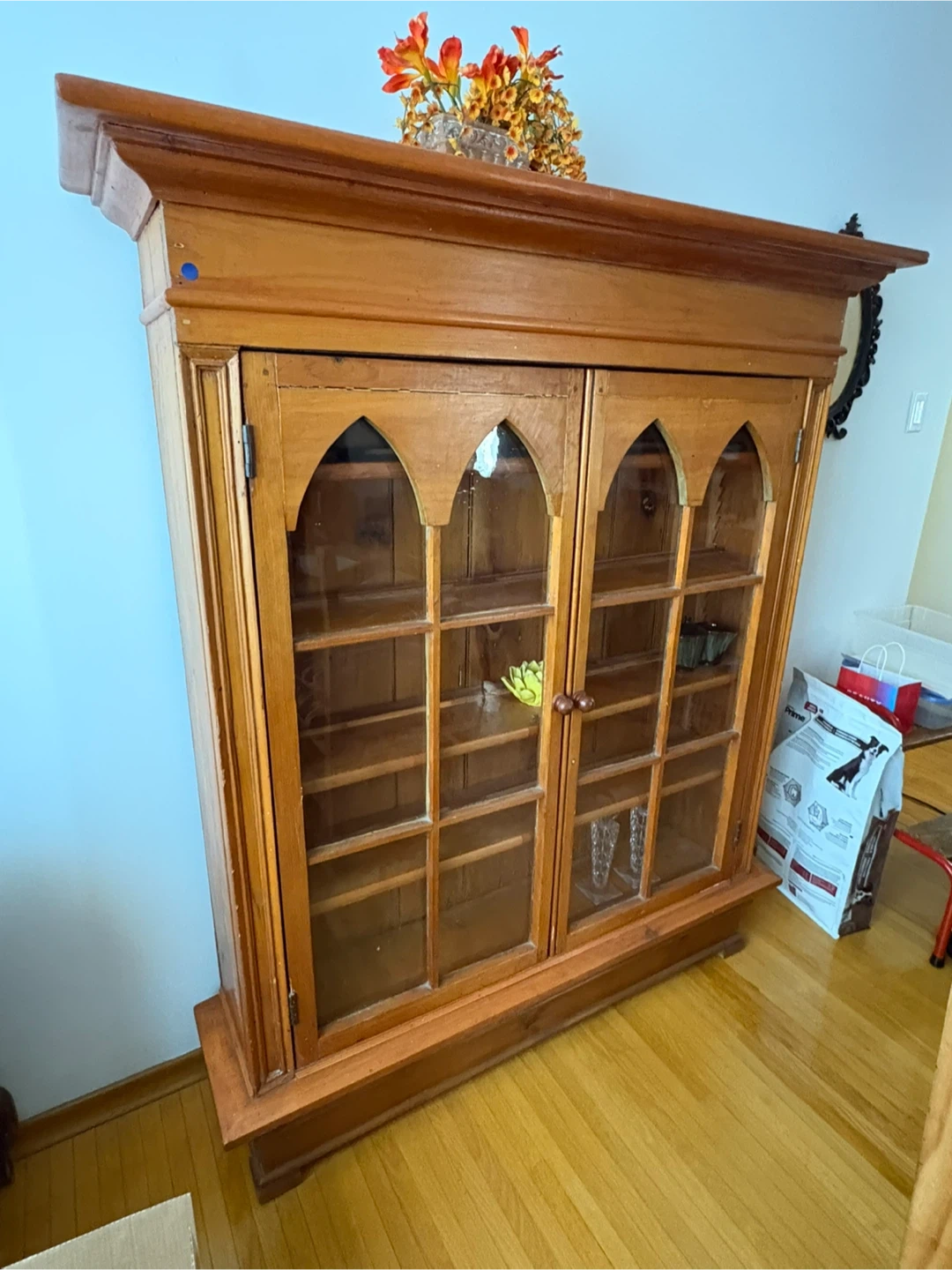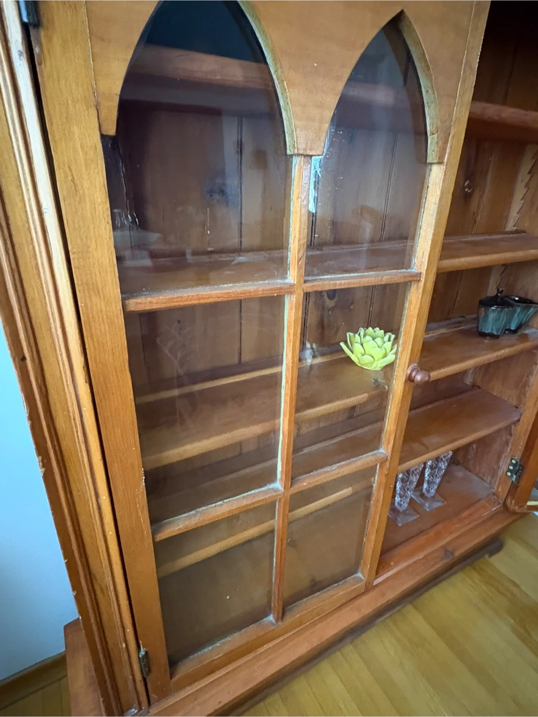 Vintage wooden display cabinet with arched glass doors. Features multiple shelves for storage and display. Solid wood construction.