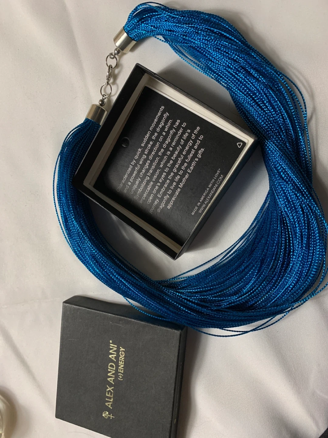 This Alex and Ani necklace features a blue dragonfly pendant. It's designed to embrace a powerful, wise life. It's made in America with love. The necklace comes with its original box.
