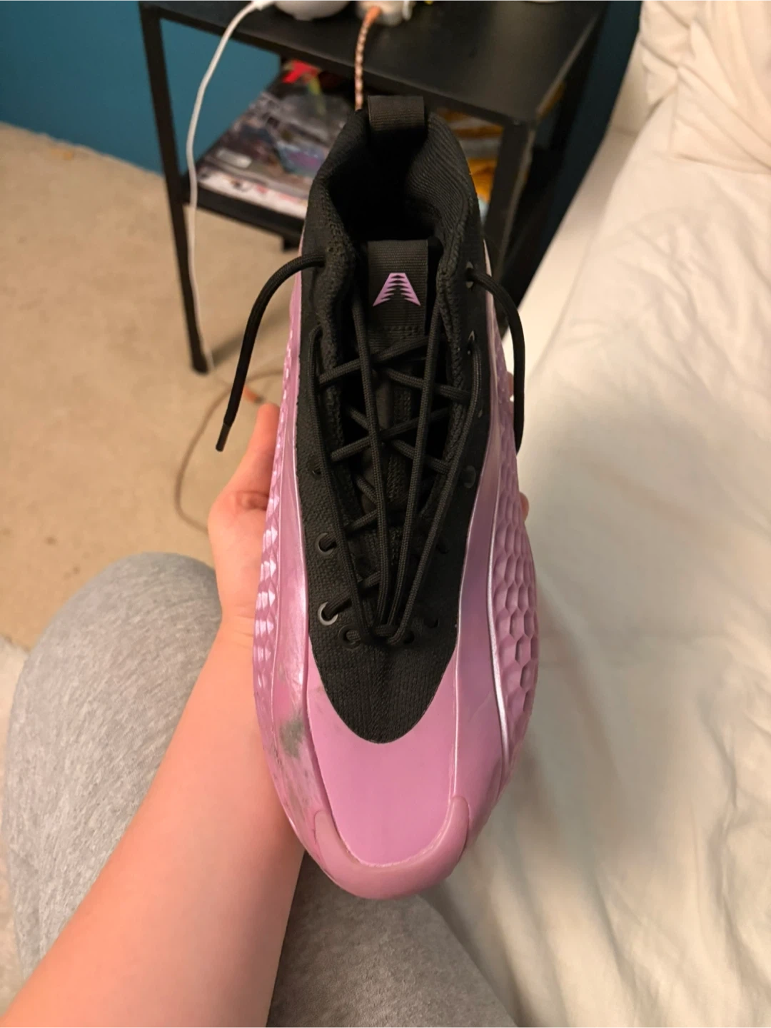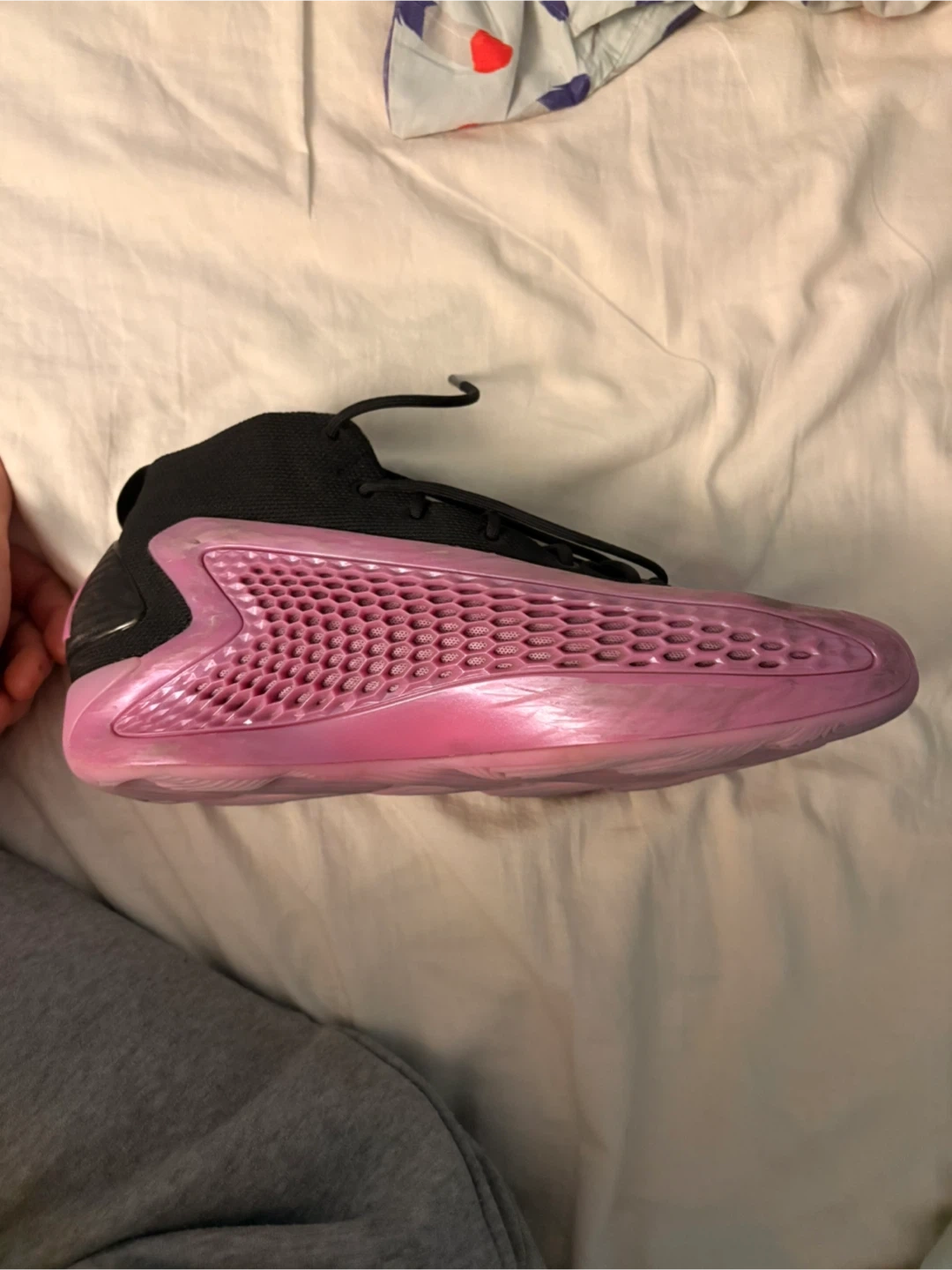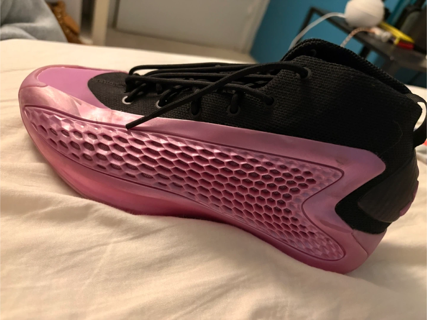 These Adidas basketball shoes are pink and black. They're built for performance on the court. The sole has a honeycomb pattern. It's a stylish and functional shoe!