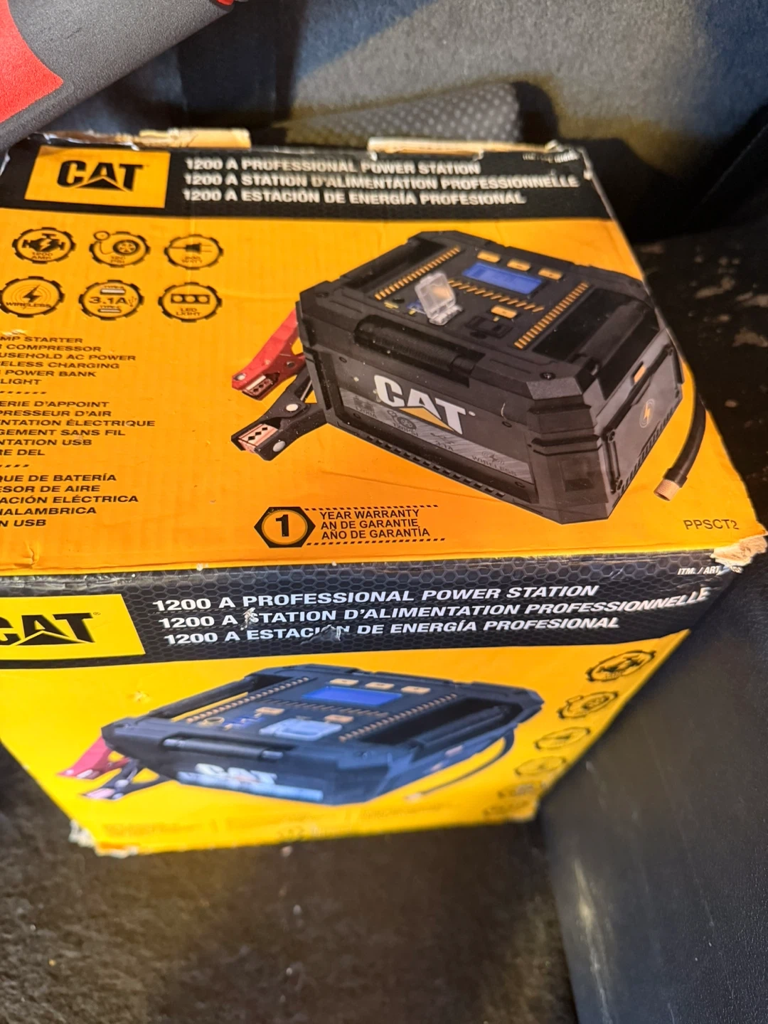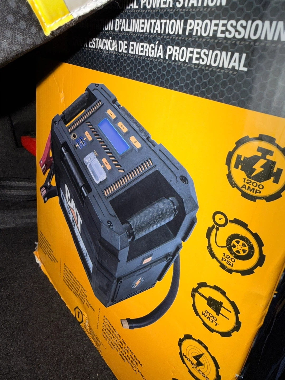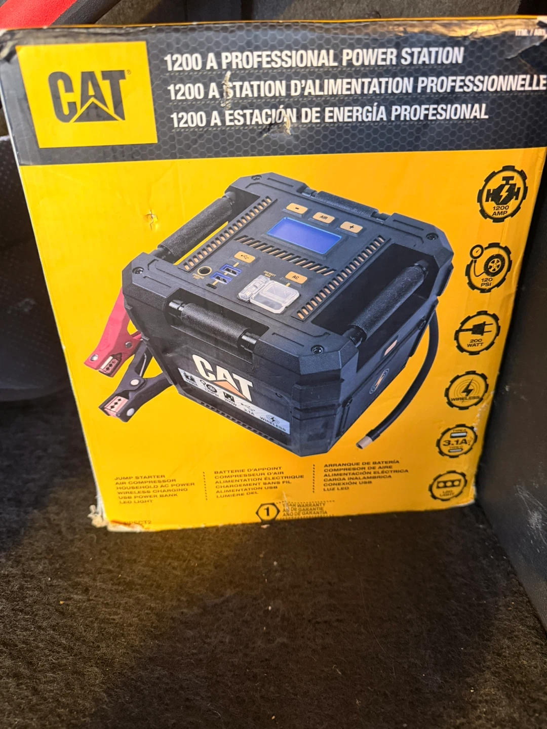 This CAT power station is a professional-grade jump starter. It includes jump starter capabilities, an air compressor, USB power bank, and an LED light. It's a versatile tool for various situations!