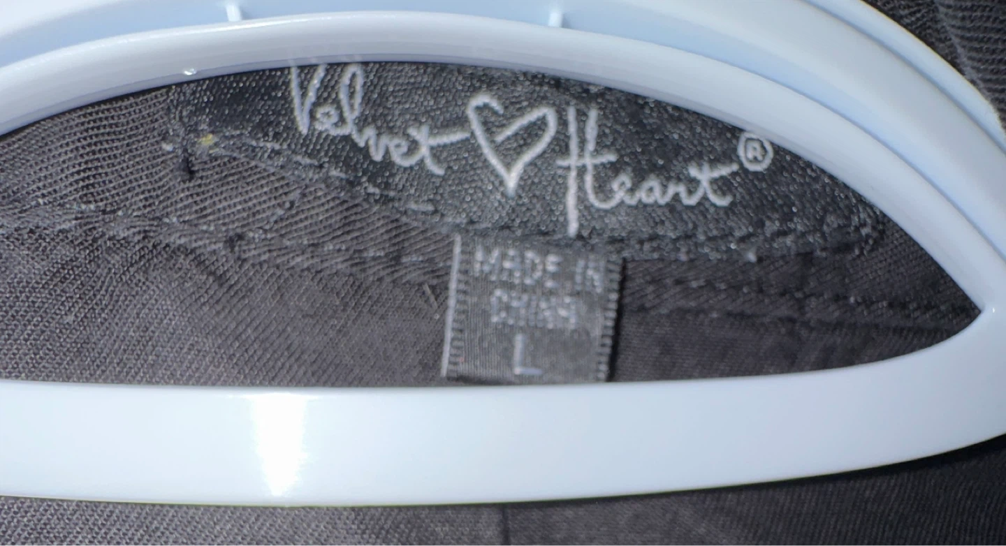 Selling a black button-up shirt from Velvet Heart in size L. It's in great condition and ready for a new home!