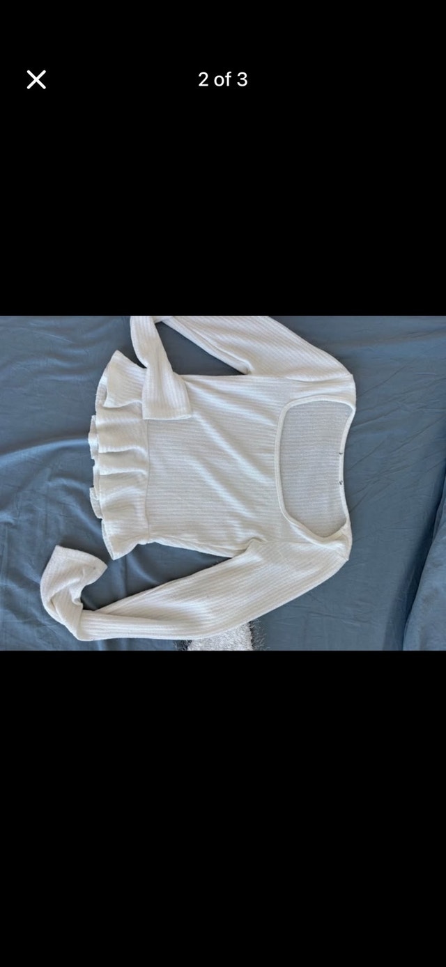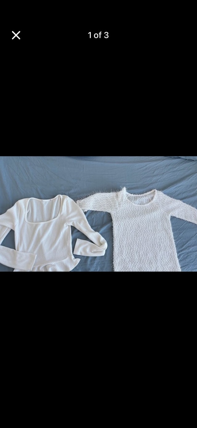 Selling a stylish set of two white long sleeve tops. The first is a ribbed top with a unique square neckline, perfect for a modern look. The second is a fluffy sweater-like material that offers a cozy and chic feel. Both tops are in excellent condition and ready to add a fresh touch to your wardrobe. If the ad is up, they are still available!
