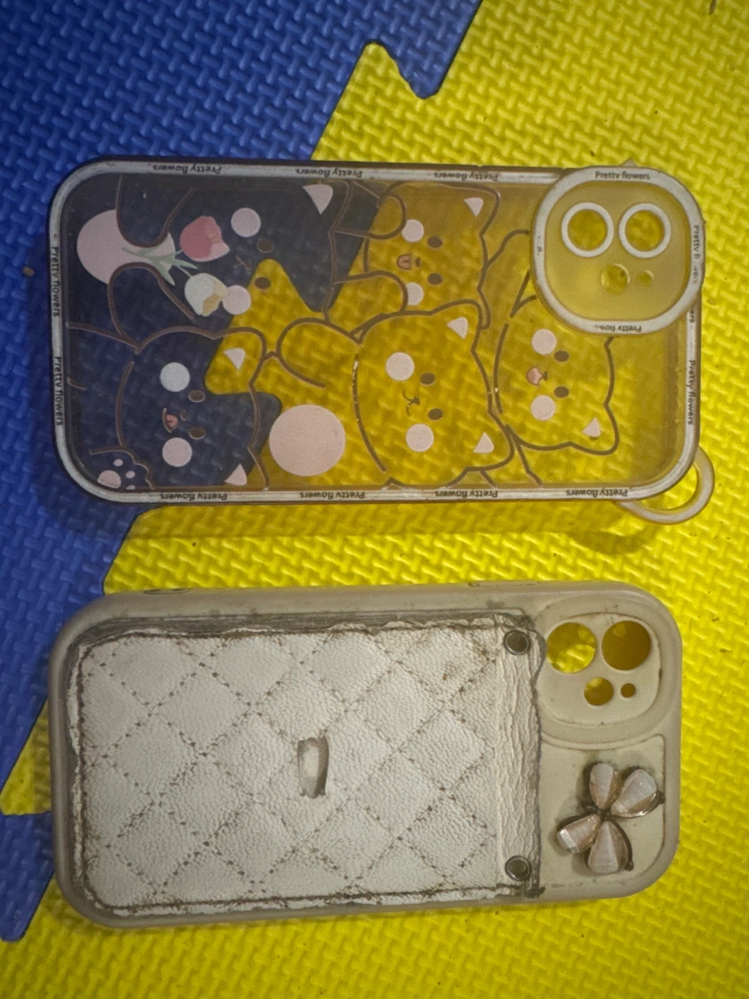 It's a cute phone case with a yellow bear and flower design. It's made of clear plastic with a quilted white backing. This case is designed for an iPhone 11. $ 2 for both