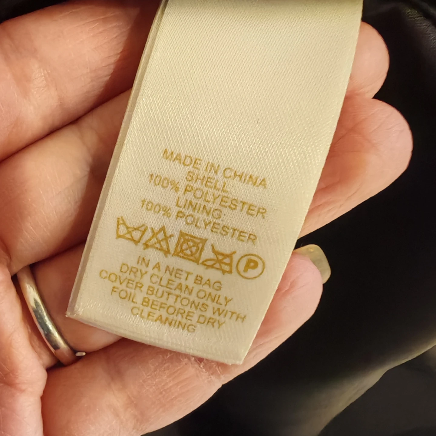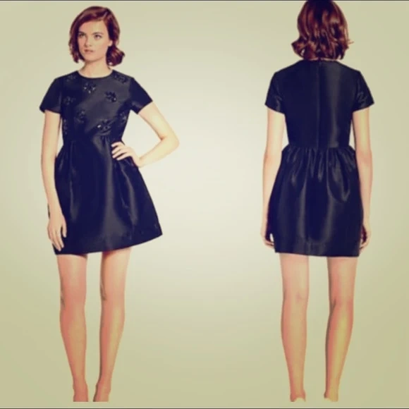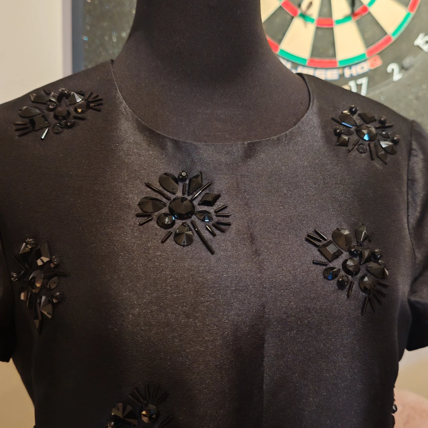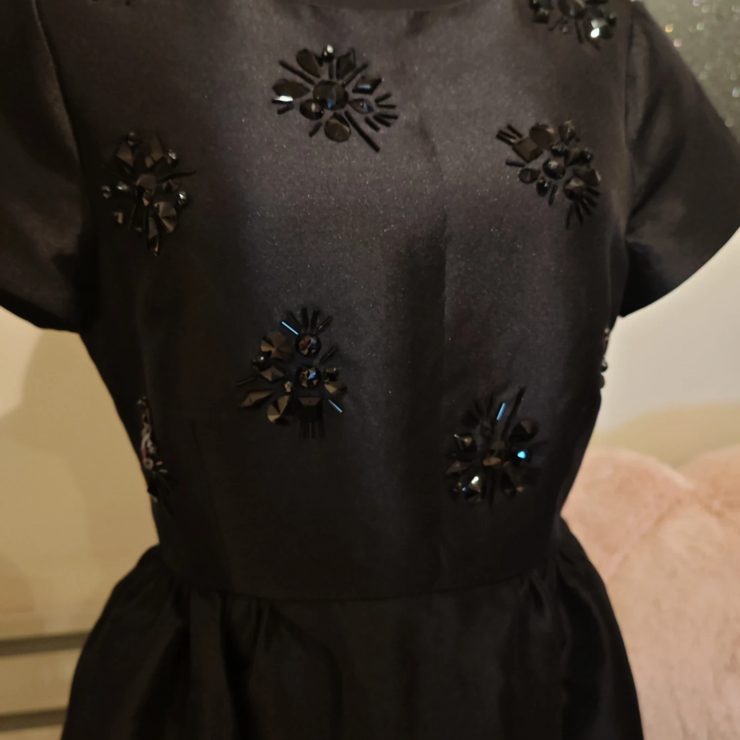 This is a black Kate Spade New York dress with short sleeves. It features a scoop neckline and is adorned with embellishments on the bodice. The skirt has a voluminous, peplum-like silhouette. It's a size 8 and made in China.