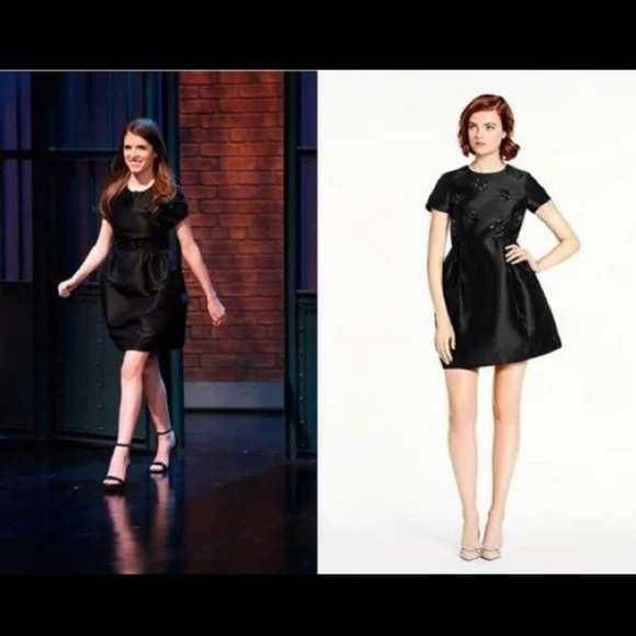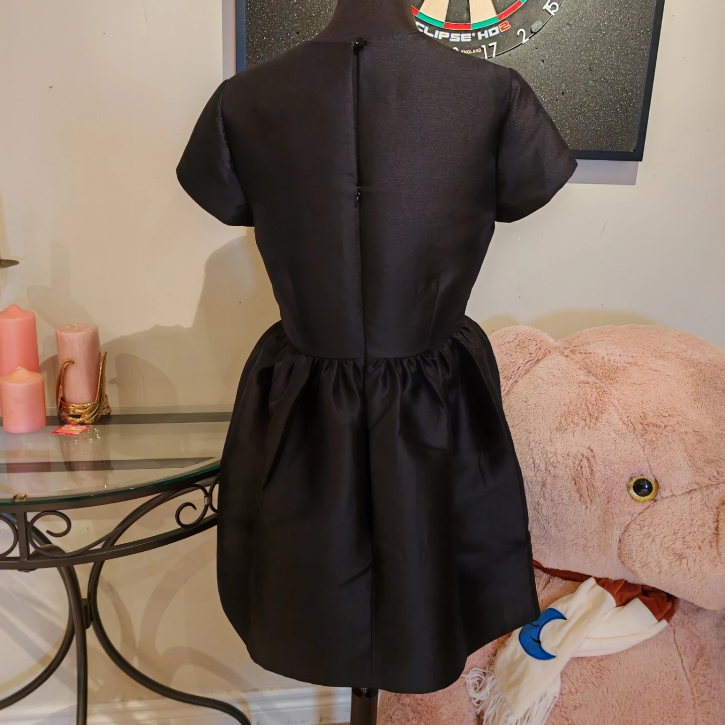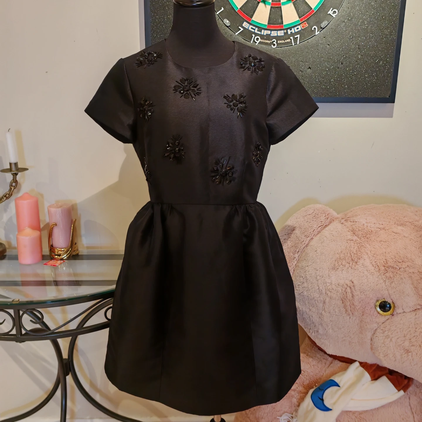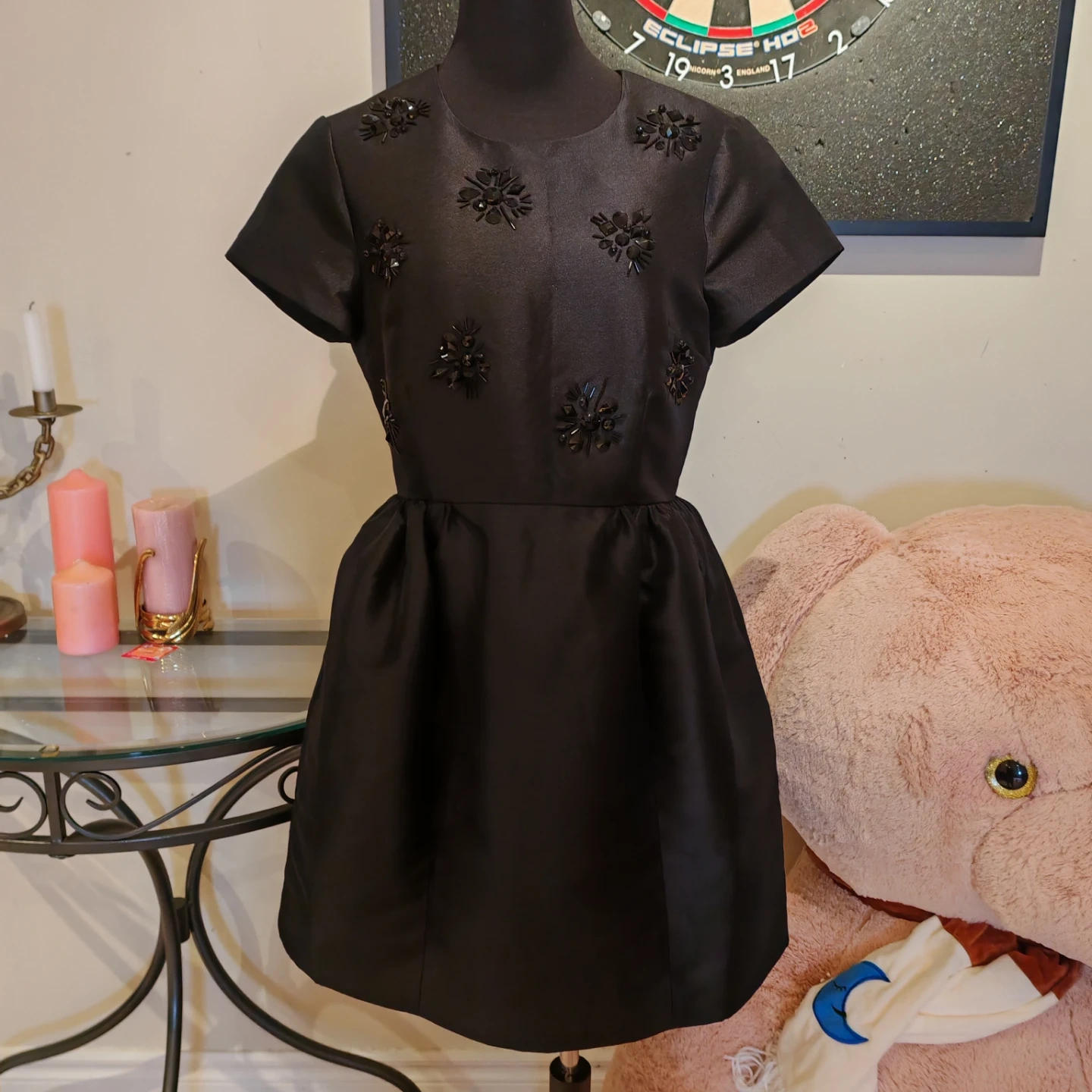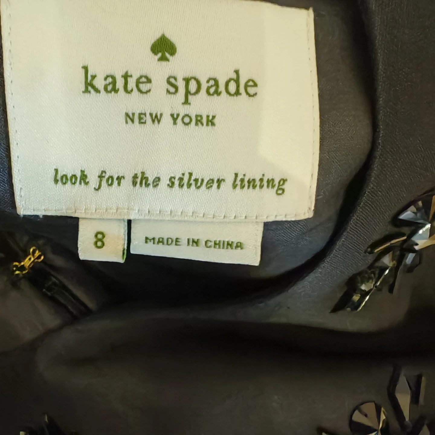 This is a black Kate Spade New York dress with short sleeves. It features a scoop neckline and is adorned with embellishments on the bodice. The skirt has a voluminous, peplum-like silhouette. It's a size 8 and made in China.