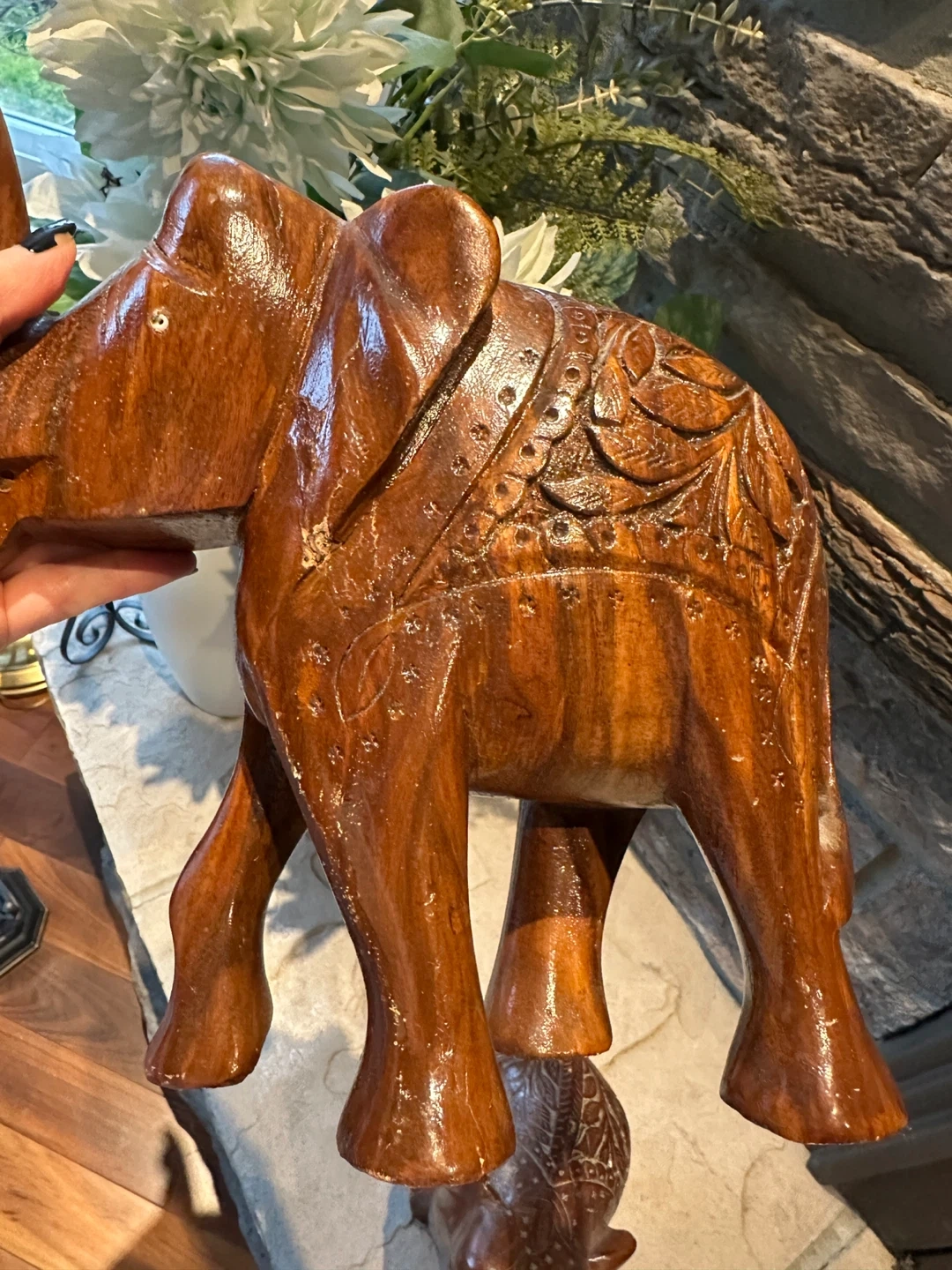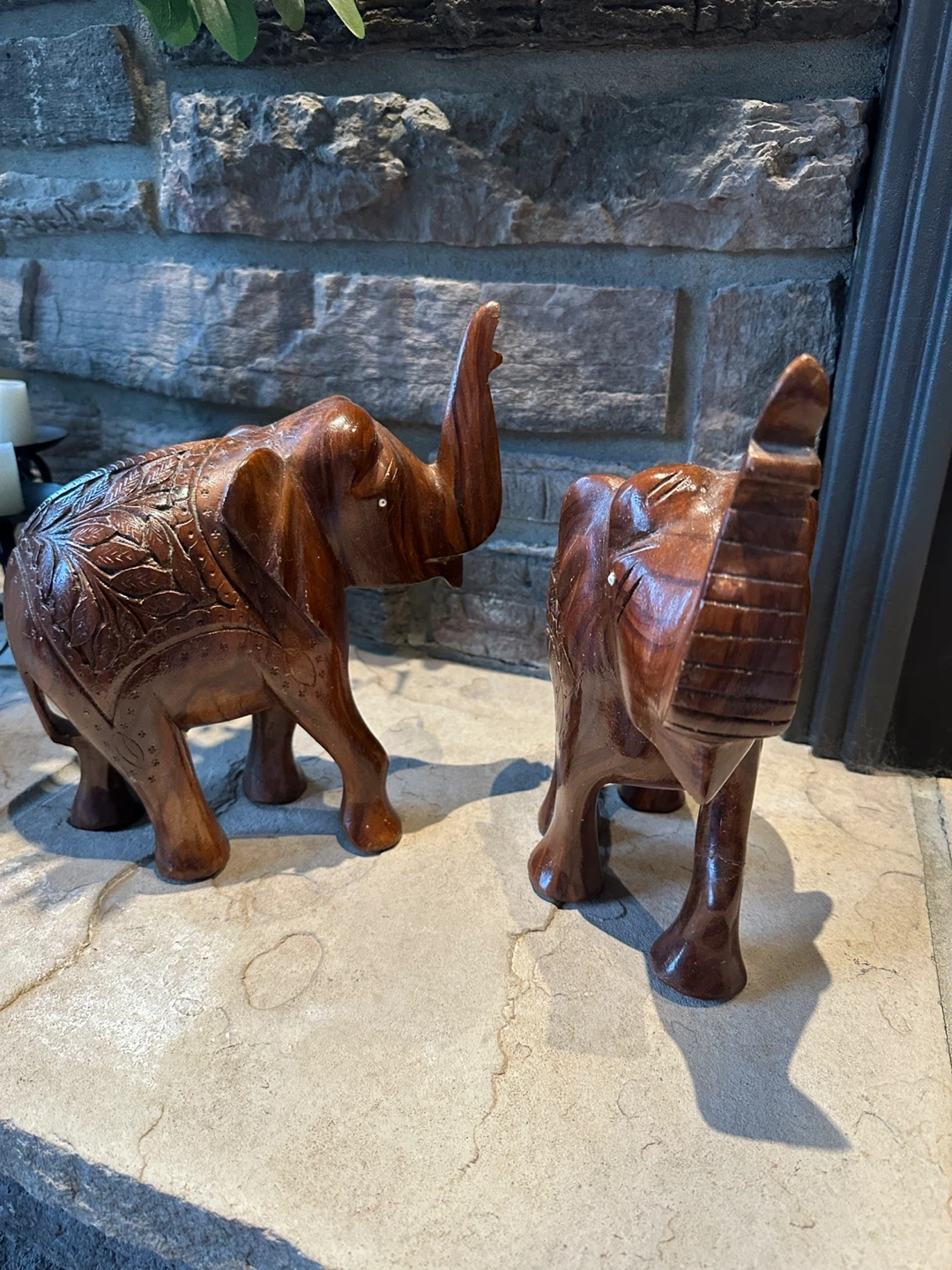A pair of intricately hand carved wooden elephants with a rich, dark wood finish. They display detailed patterns on their backs and are finished with a glossy sheen. These decorative pieces add a touch of elegance to any room.