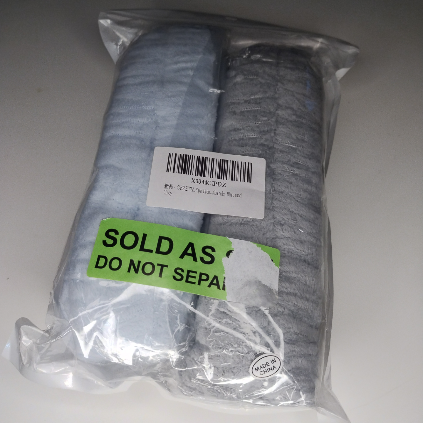 Two stretchy headbands sets. Grey and light blue. Great elasticity. Soft microfiber material. Sold as a pair. Do not separate.