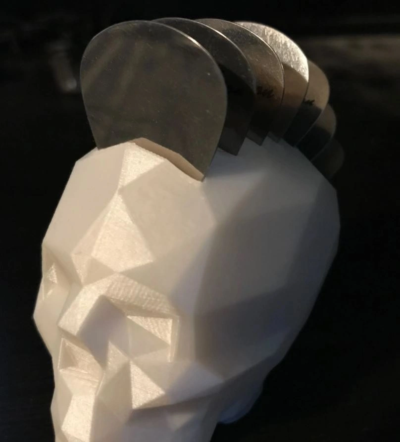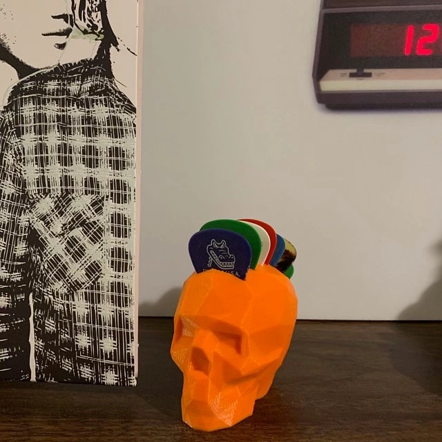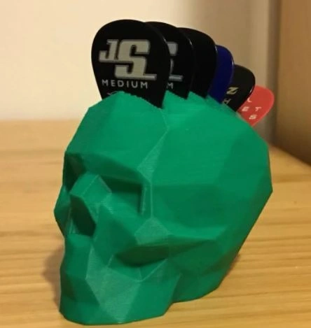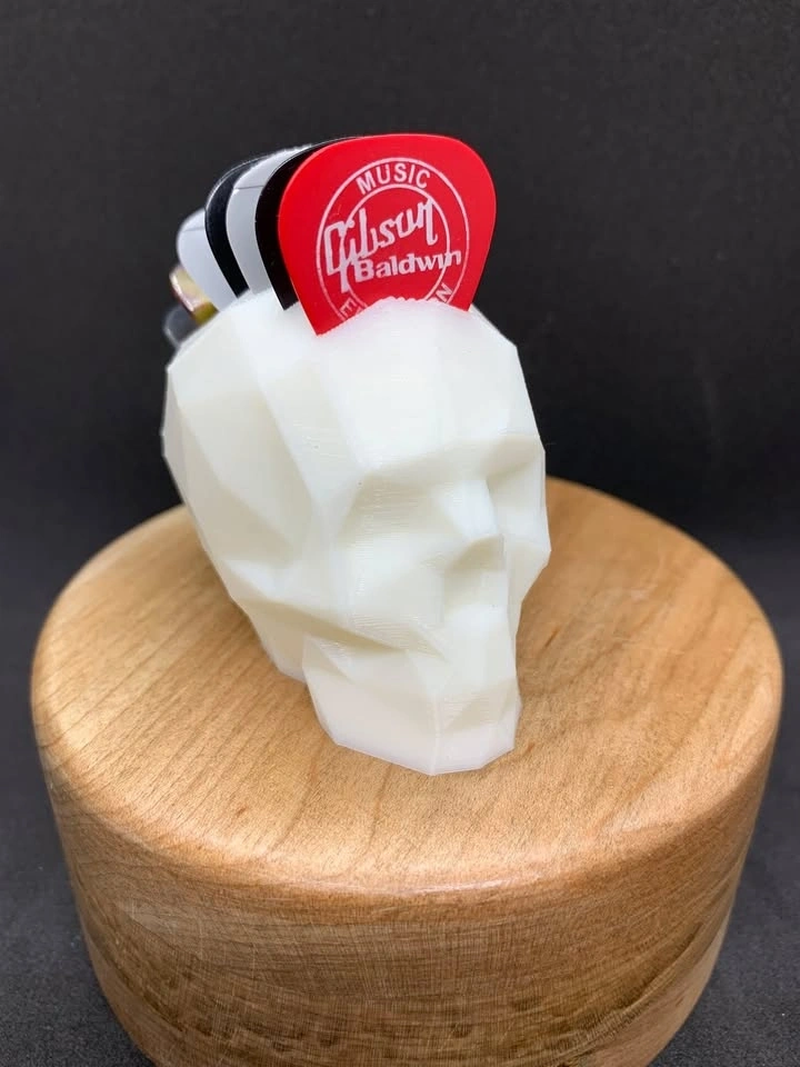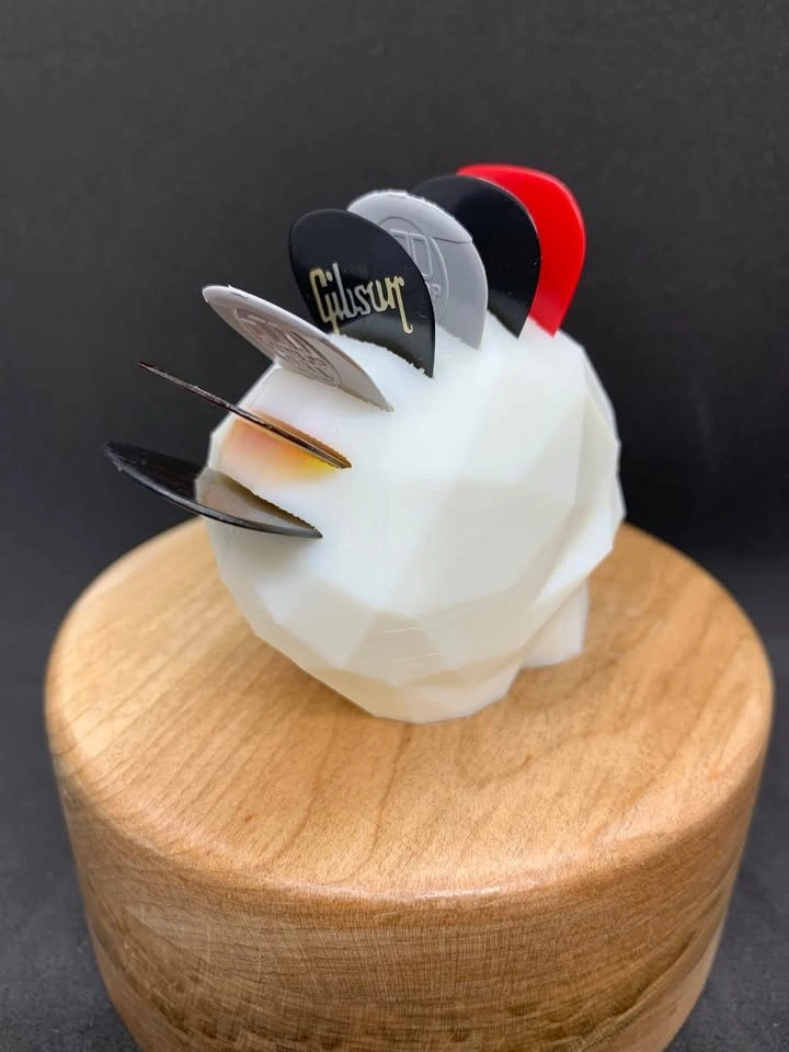 Skull pick holder with picks running front to back, giving it a Mohawk style. Holds 7 picks. Can be printed in the color of your choice.