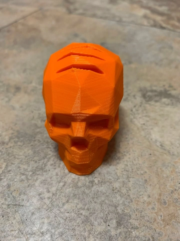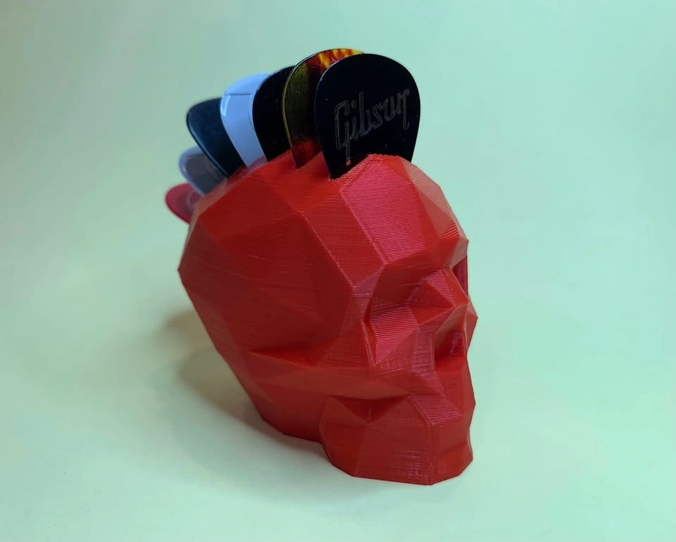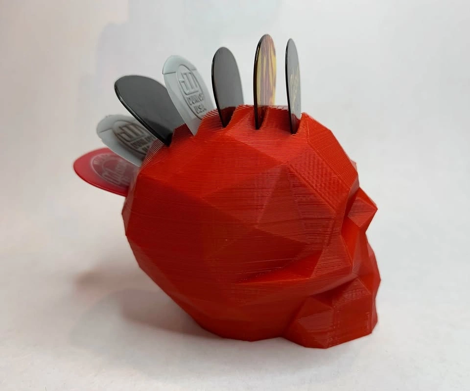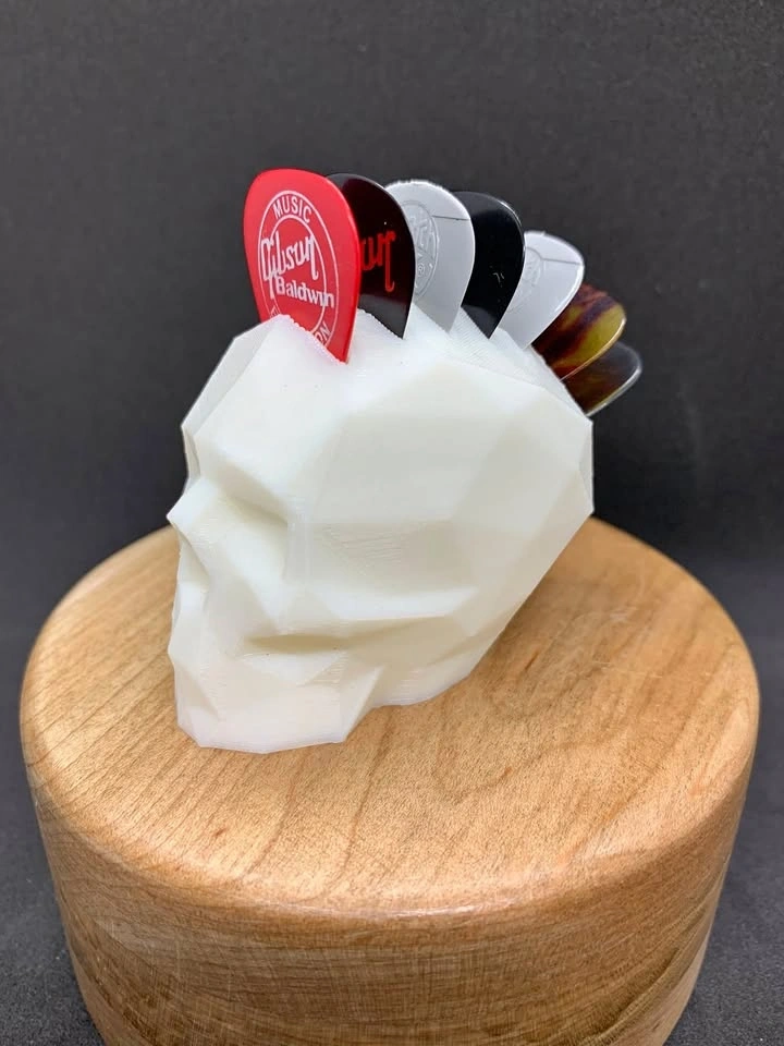 Skull pick holder with picks running front to back, giving it a Mohawk style. Holds 7 picks. Can be printed in the color of your choice.