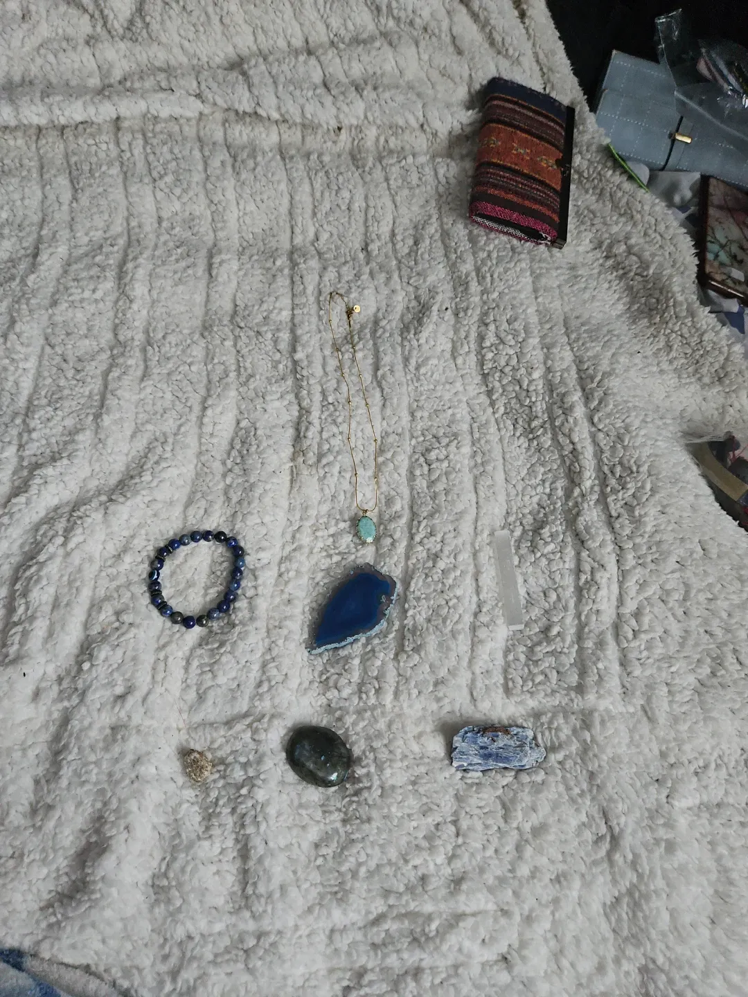 Selling a collection of gemstones and jewellery pieces, including a blue beaded bracelet, a gold necklace with a turquoise pendant, and various raw gemstones in different colours and shapes. Perfect for anyone interested in crystals or jewellery making!