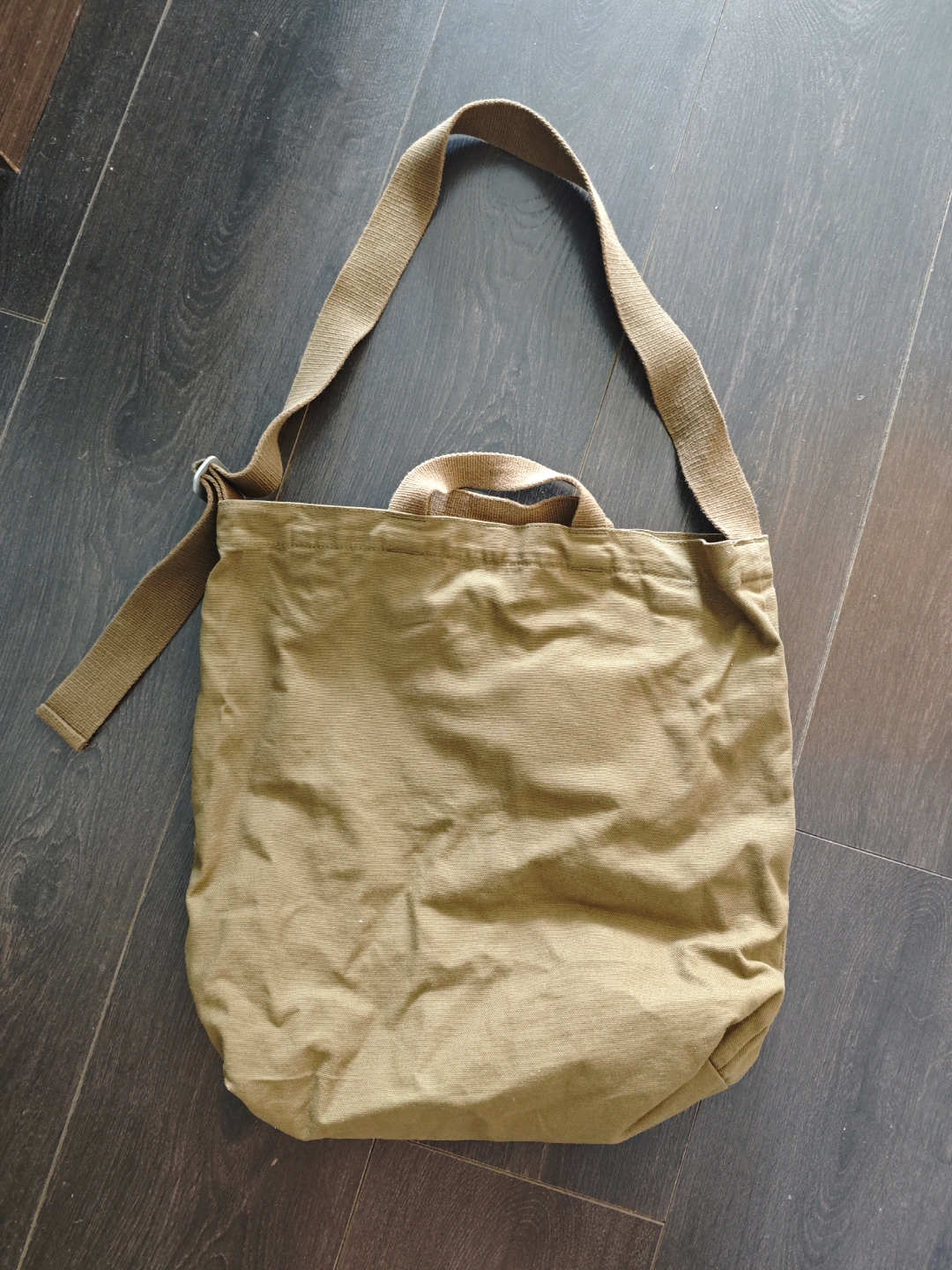 Olive green canvas tote bag. Features long shoulder strap and smaller top handles. 100% certified organic cotton. Perfect for everyday use.