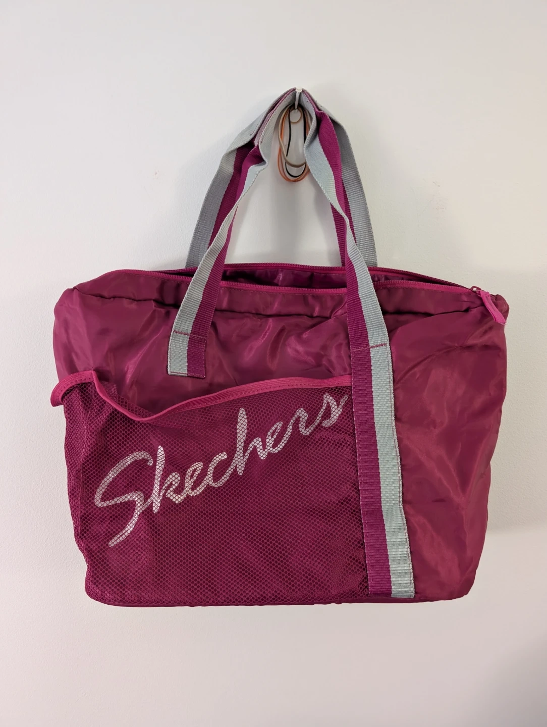 This Skechers vintage tote bag is a vibrant pink color. It features a mesh front pocket with the Skechers logo. The interior has multiple pockets for organization. It's perfect for everyday use or for carrying gym essentials!