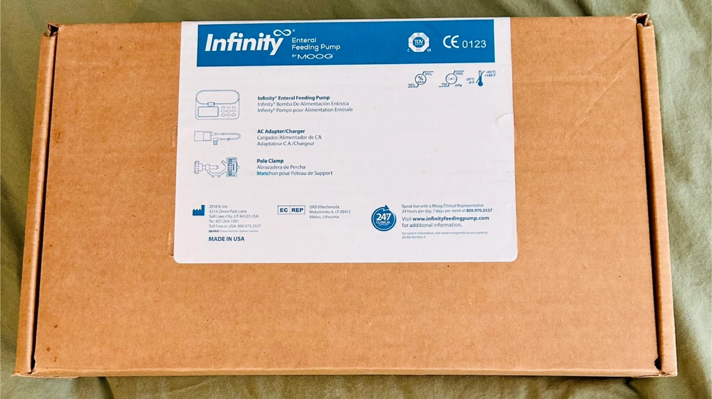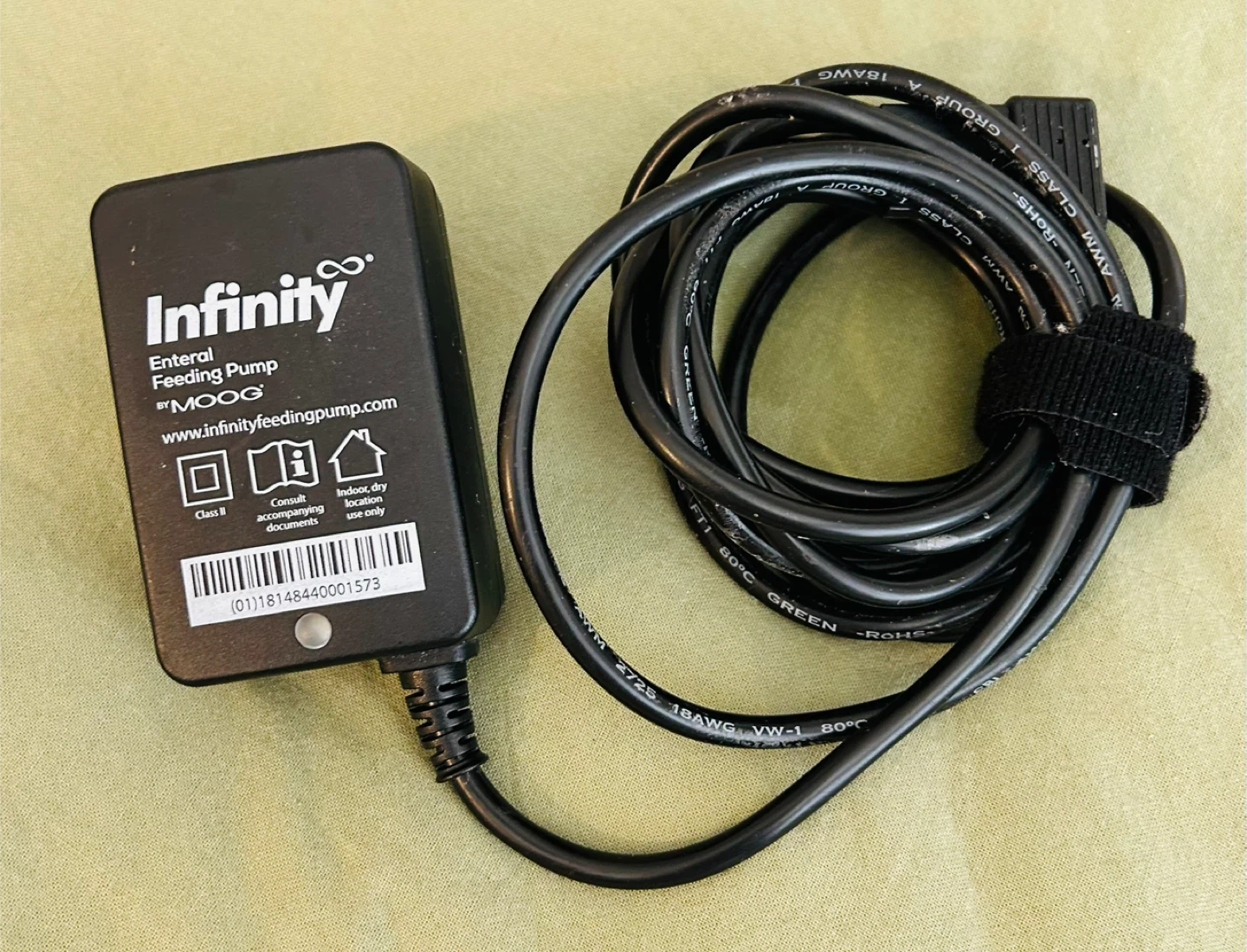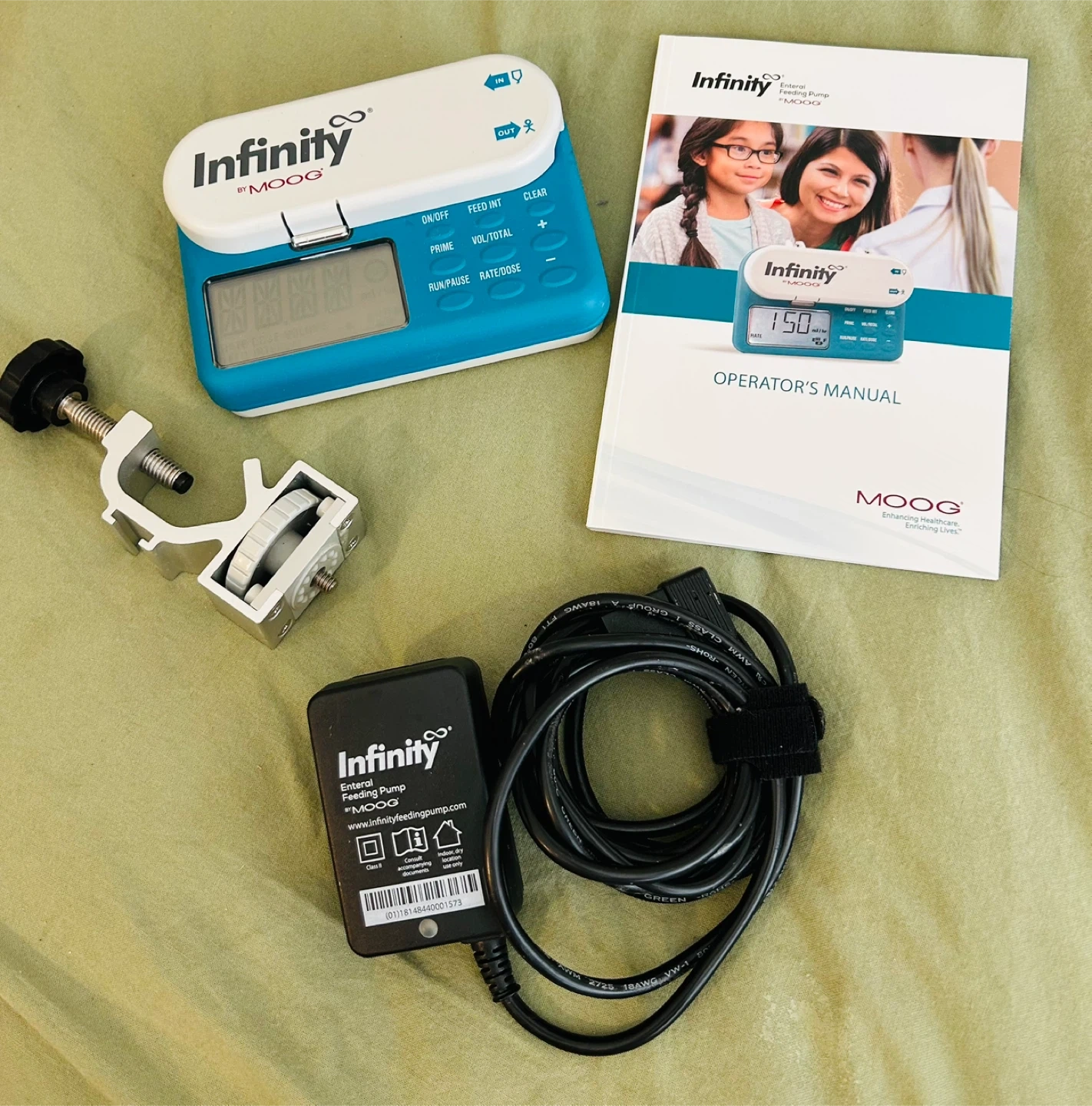 This is an Infinity Enteral Feeding Pump by Moog. It's a portable device for administering liquid nutrition. Includes the pump, power adapter, and operator's manual.