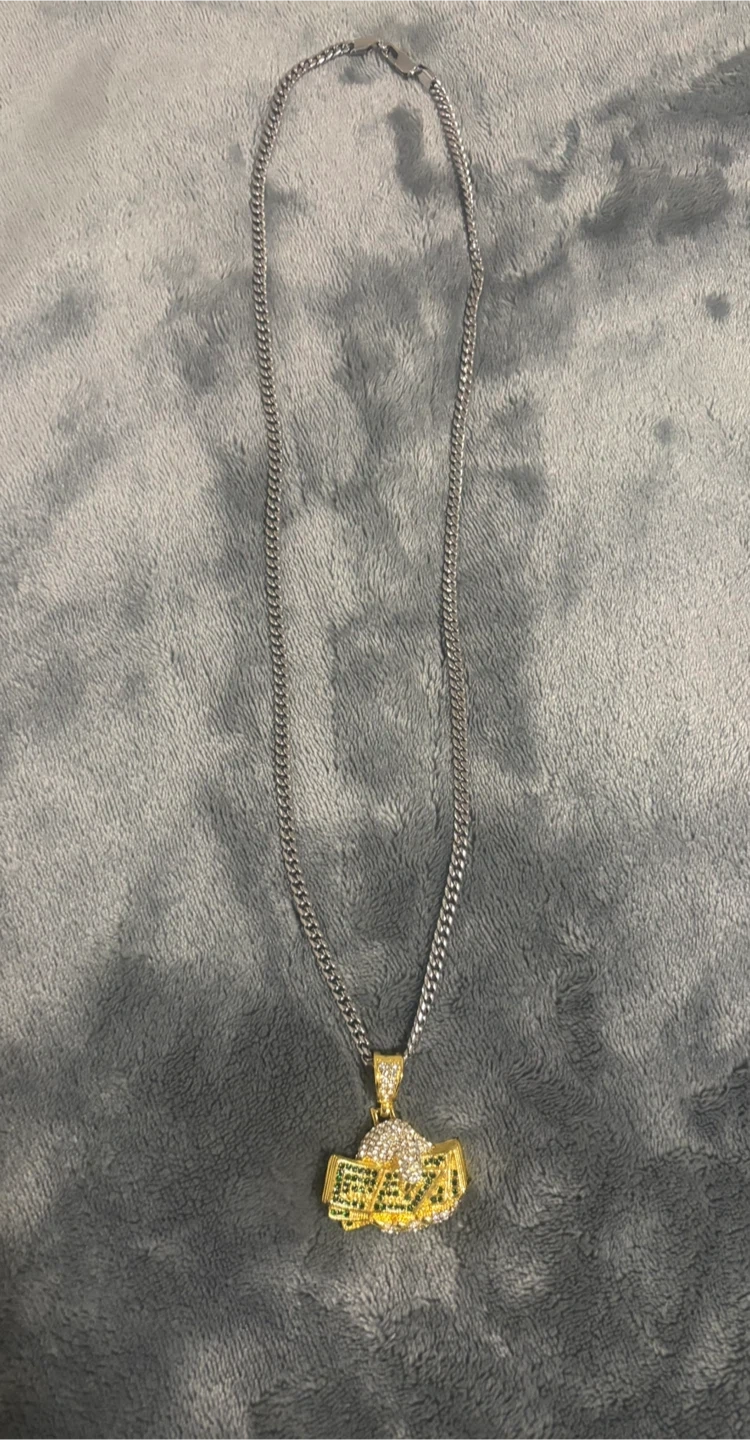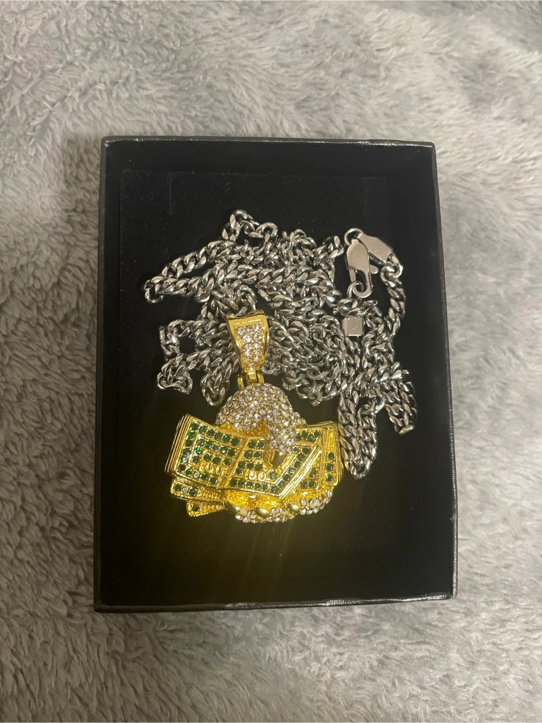 94Money Bag synthetic zircon two-toned chain Chain link is diamond cut 925 silver plated 24" alongside a synthetic zircon 18k gold plated pendant, comes in gift box. (Negotiable Price)