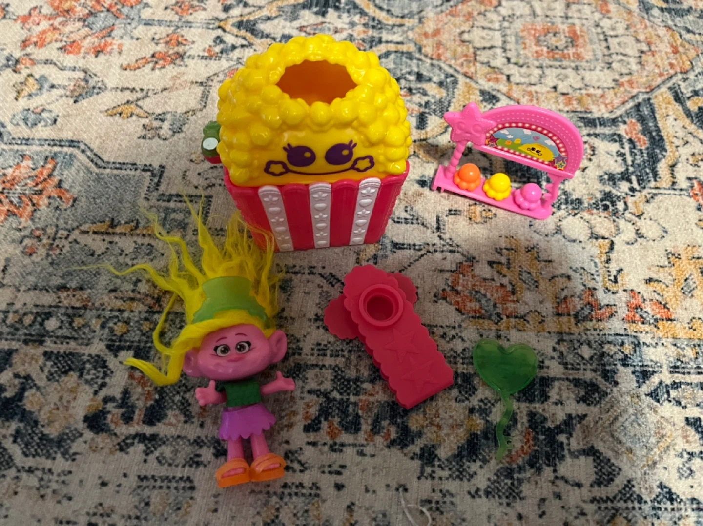 This is a Trolls Viva Popcorn Cart playset. It includes a popcorn container, a small stand with three figures, and a heart-shaped balloon accessory. It's a fun playset for fans of the Trolls movies!