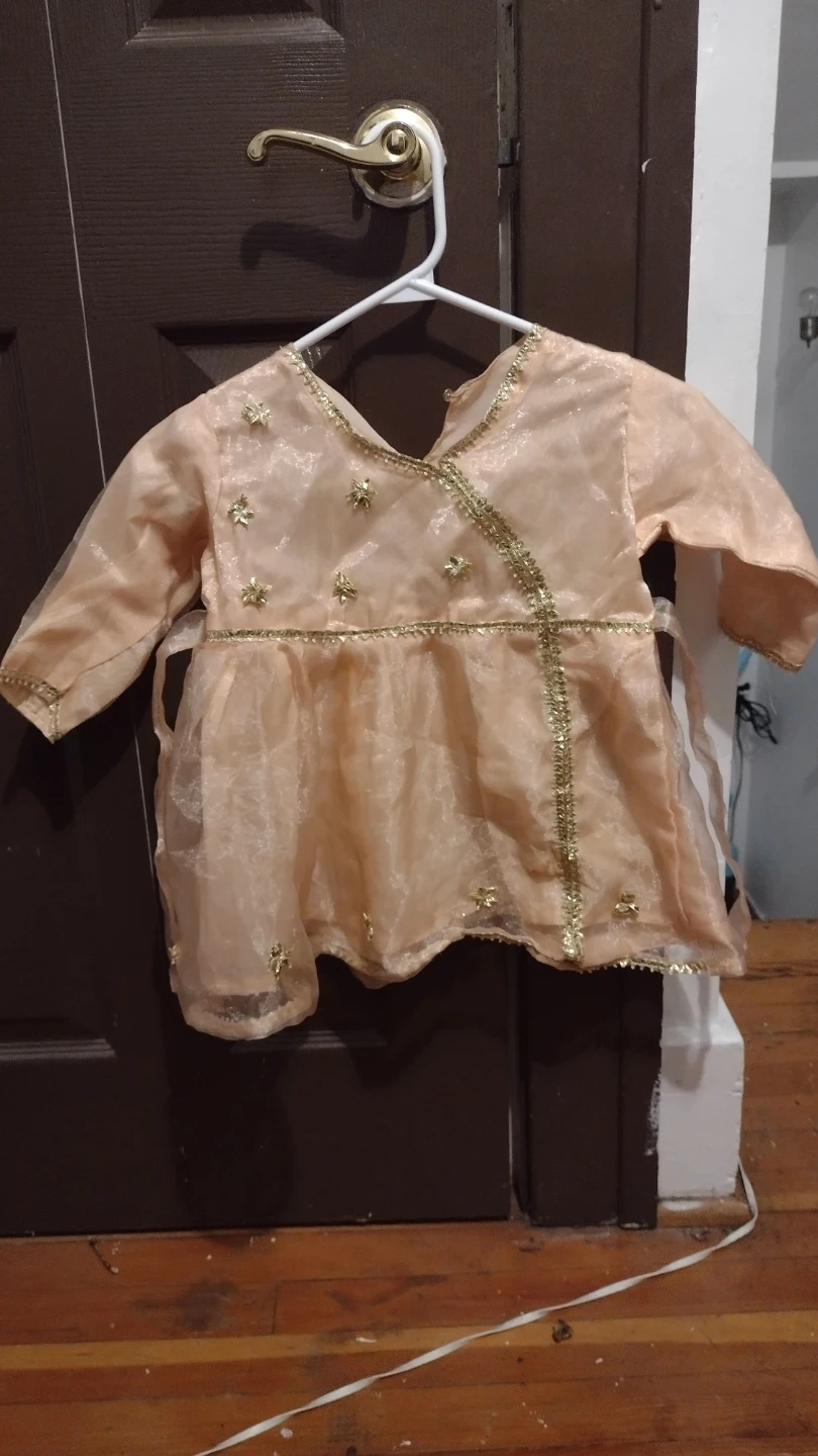 A super cute dress for a baby girl! It's in great condition and features a lovely peach colour with gold detailing. Perfect for a special occasion or just looking adorable!