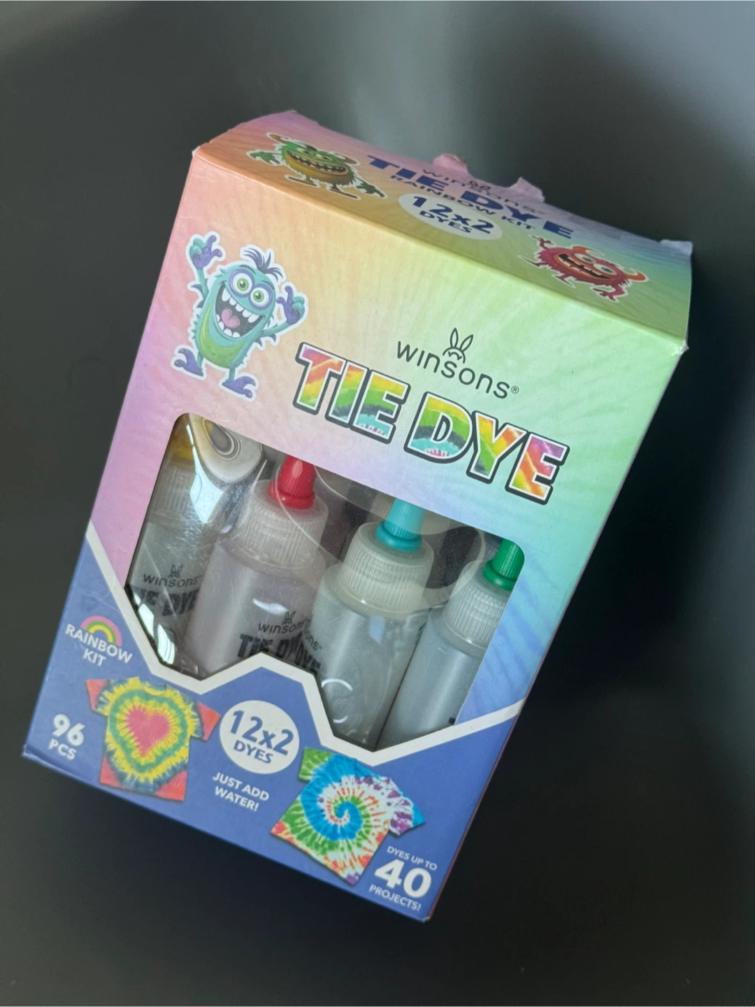 Brand new Winsons Tie Dye kit! It comes with everything you need to create up to 40 colourful projects. The box includes 12 x 2 dyes, a rainbow kit, and all the necessary supplies to get started. Perfect for a fun and creative activity!
