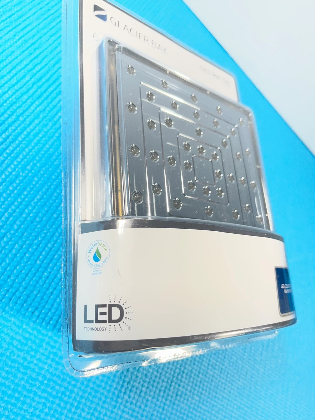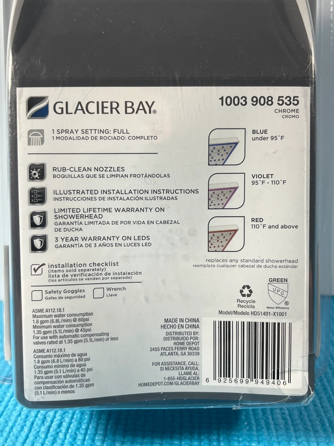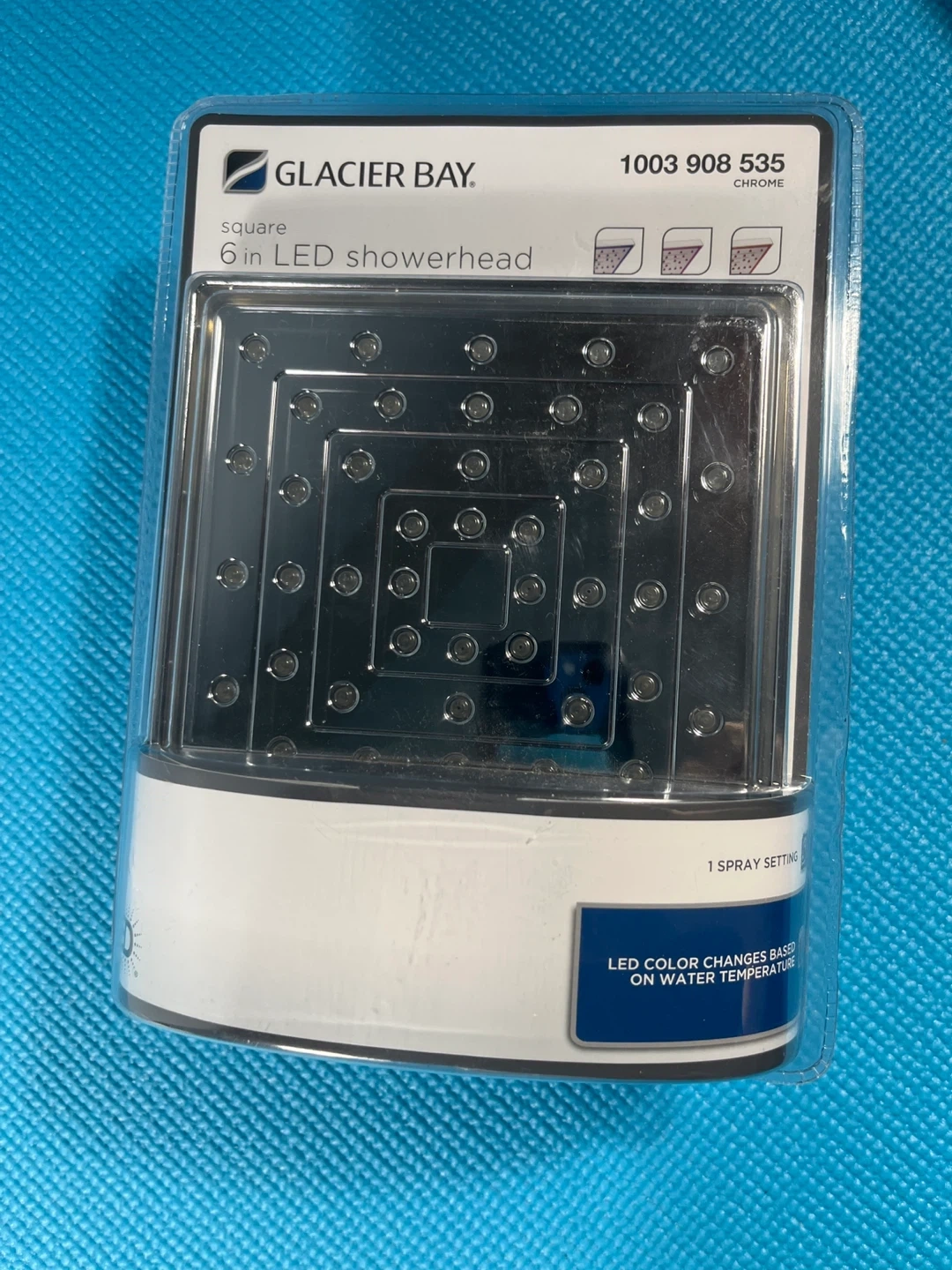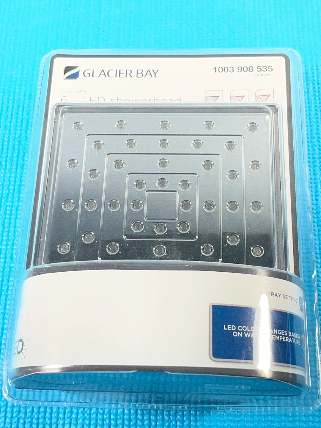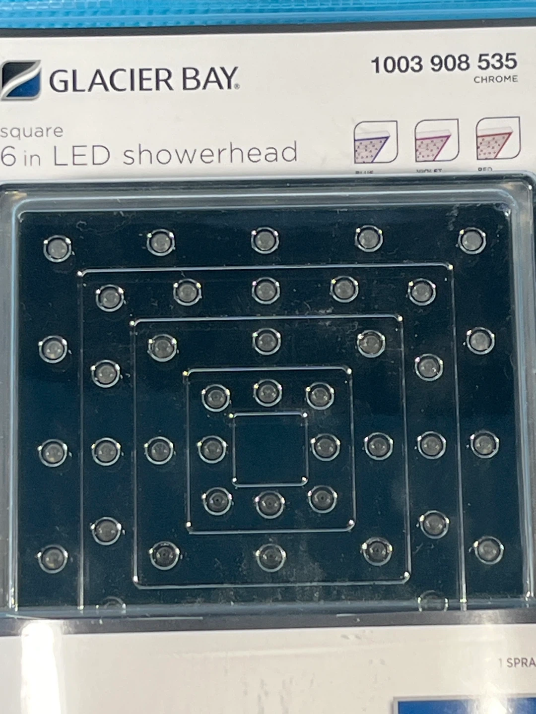 This Glacier Bay 6-inch Square LED Showerhead (Model #1003 908 535) is a water-powered fixture that changes color based on water temperature, requiring no batteries or external power.