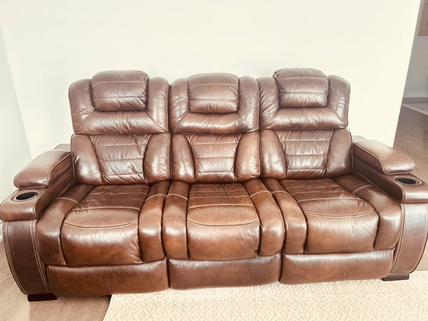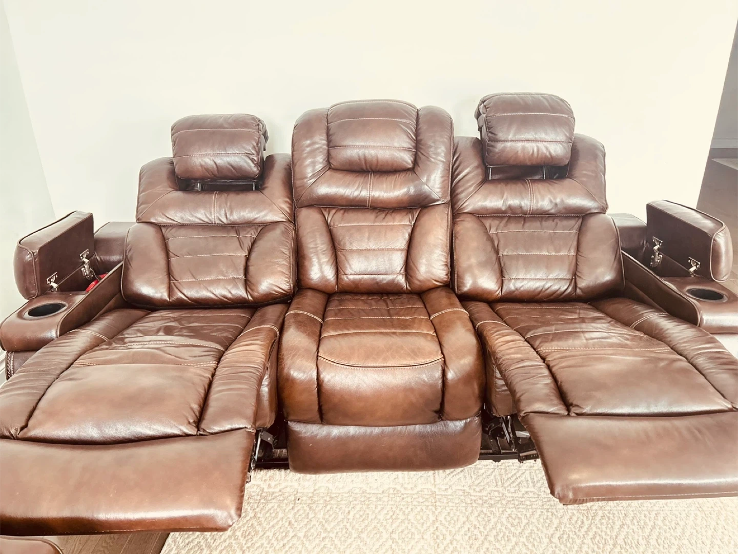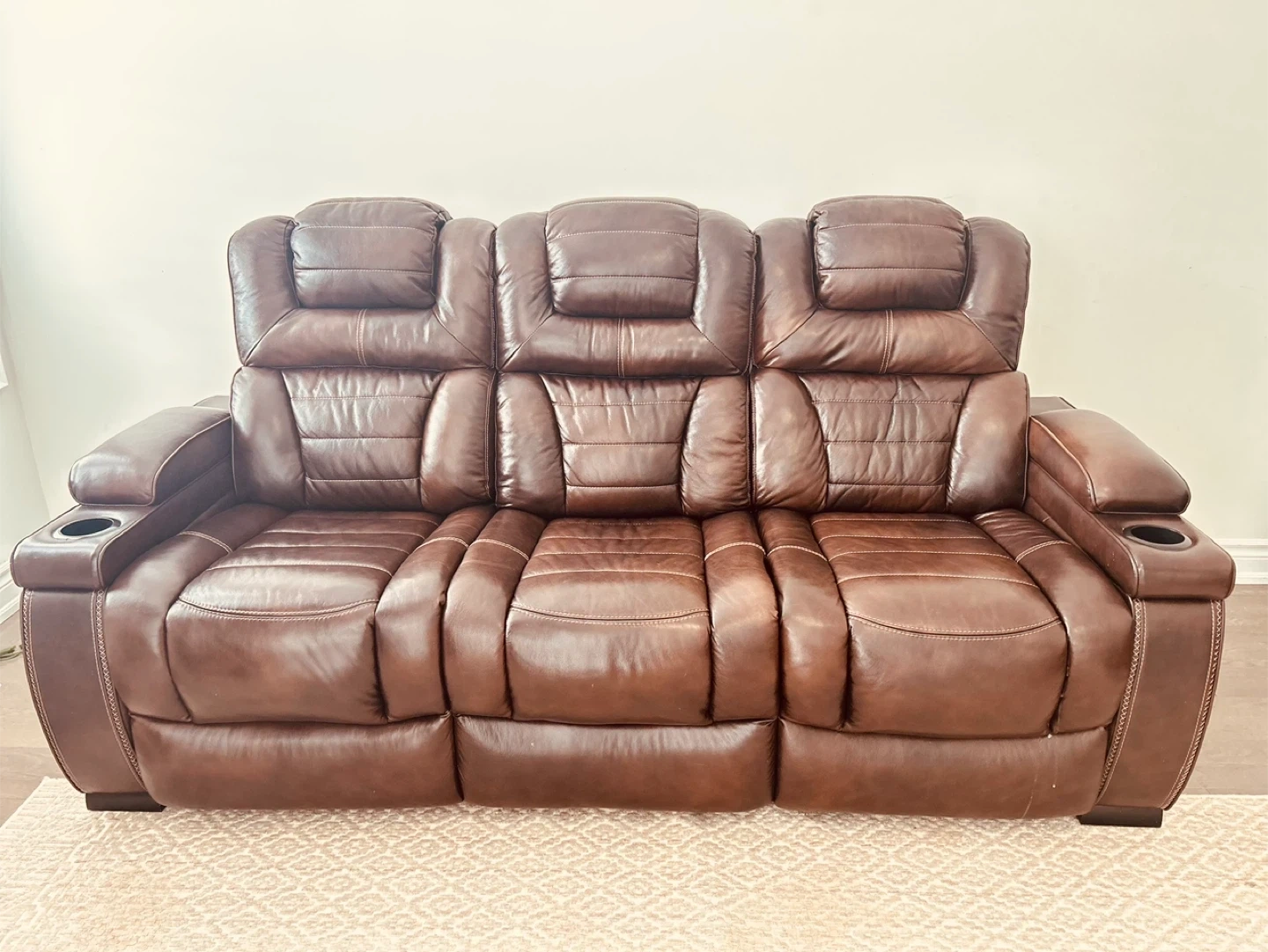 Three-seat reclining loveseat in rich brown leather. It features powered recliners on each end and a convenient centre console with cup holders and power outlets. This sofa's comfortable design makes it great for home theatres!