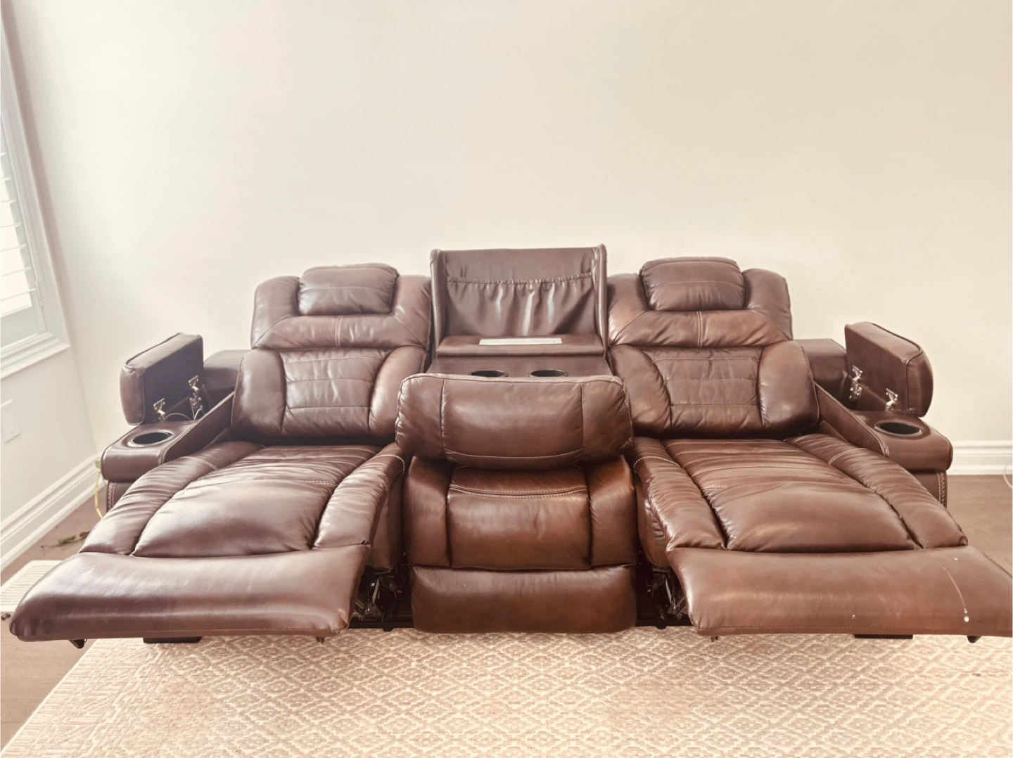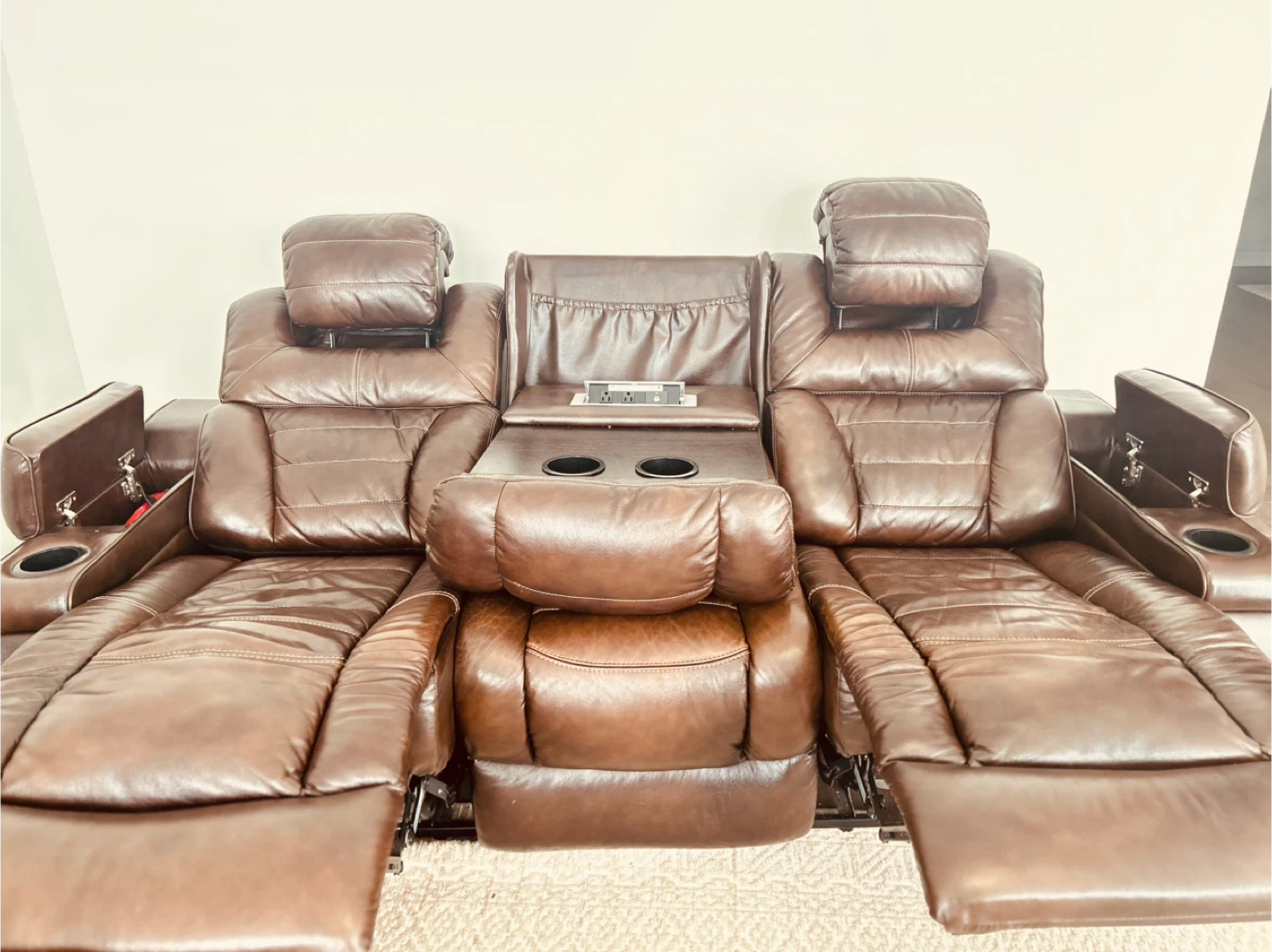 Three-seat reclining loveseat in rich brown leather. It features powered recliners on each end and a convenient centre console with cup holders and power outlets. This sofa's comfortable design makes it great for home theatres!