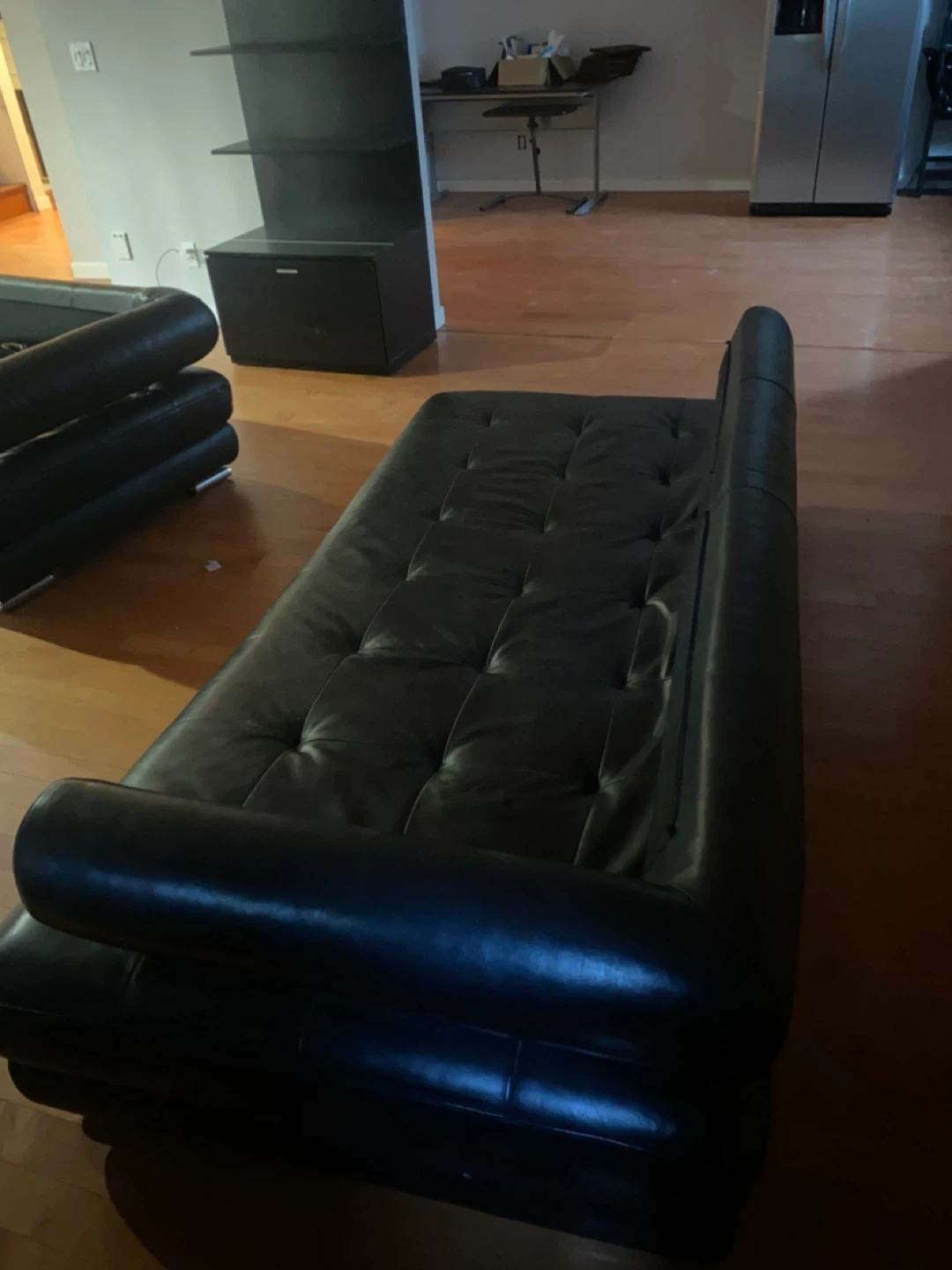 This is a scan design black leather sectional sofa with tufted seats and chrome legs. It offers ample seating space and a modern look for your living area.