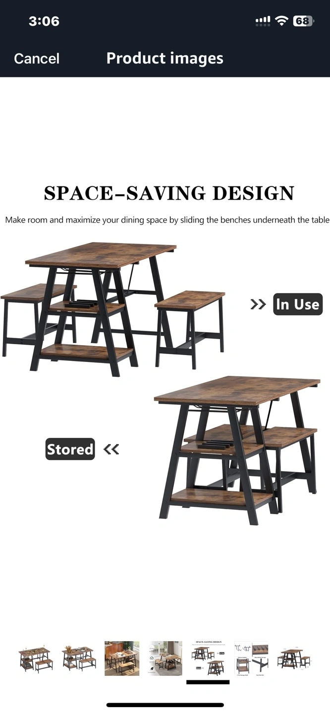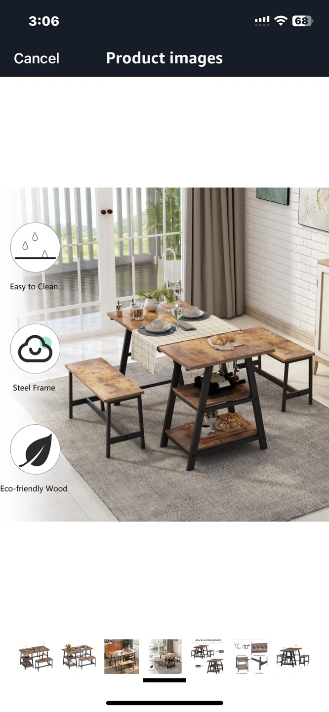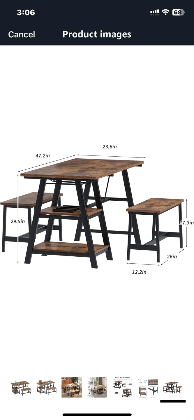 Rustic brown wood and black metal dining table and two benches. Space saving design, benches slide under table. Easy to clean. Eco-friendly wood and steel frame.